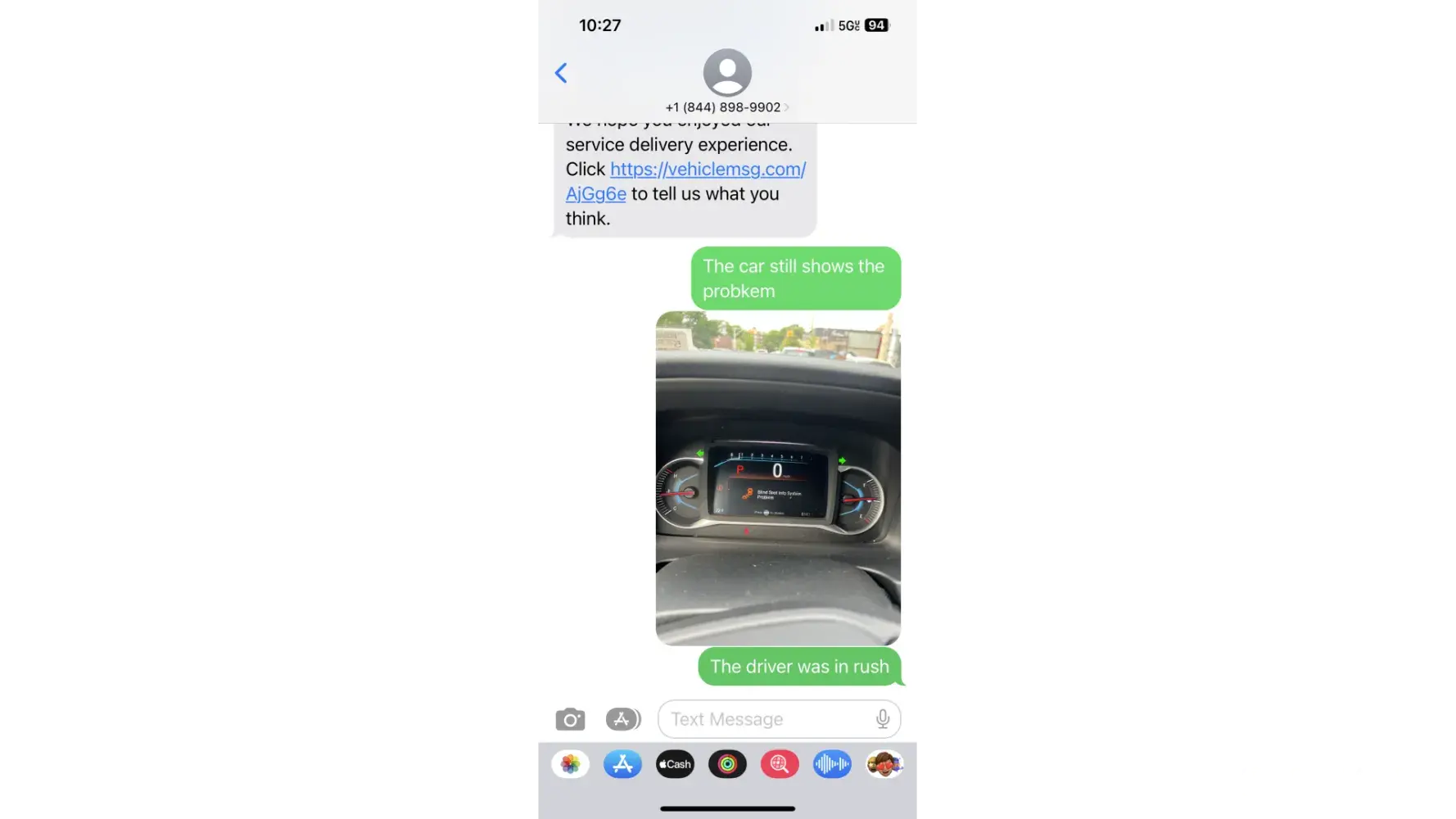 However, my disappointment resurfaced when, at 4:27 pm, I received a call from the driver, Boris, notifying me that he would be dropping off the car shortly. I met him outside and, before accepting the car, I checked the display to ensure that the problem had been resolved. To my dismay, the same message of "Blind Spot System Problem" was still being displayed. I immediately informed Boris of the ongoing issue, but he was unable to provide any insight and mentioned that he would pass along the message for me. As he was in a rush, he had to leave promptly, leaving me unsatisfied and with an unresolved problem.