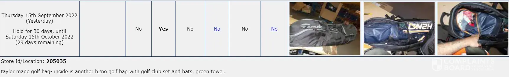 Booked the delivery via Parcelforce Worldwide PFW5576678, but the golf bag was never delivered. Filed a complaint with Parcelforce, still open. Then VALENTINA IDINI from Parcel2GO got in touch (Parcelforce Worldwide PFW5576678 | Parcel2Go.com Case ID:2503611 : 5576678) and sent some pictures of a black Taylormade travel bag with a H2NO blue bag inside (orange zips) they had found in one of your depos (Store ID/Location: 205035), asking whether it was mine. I said it was but have not heard back since.