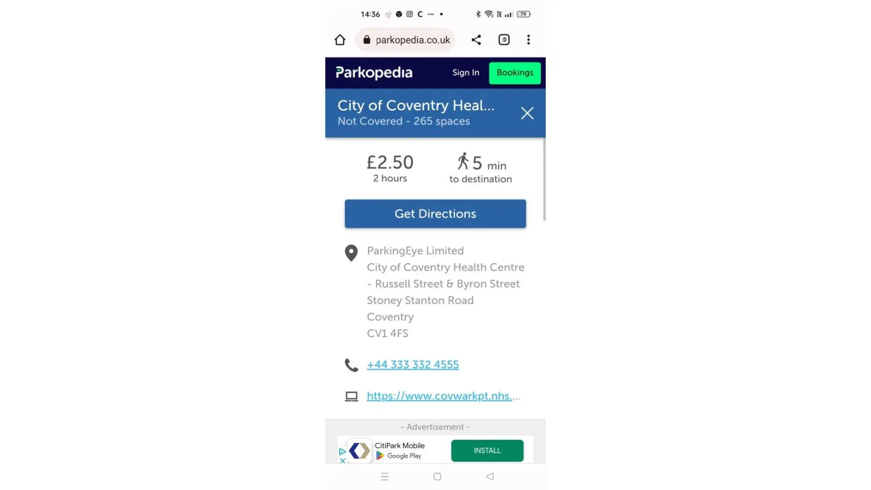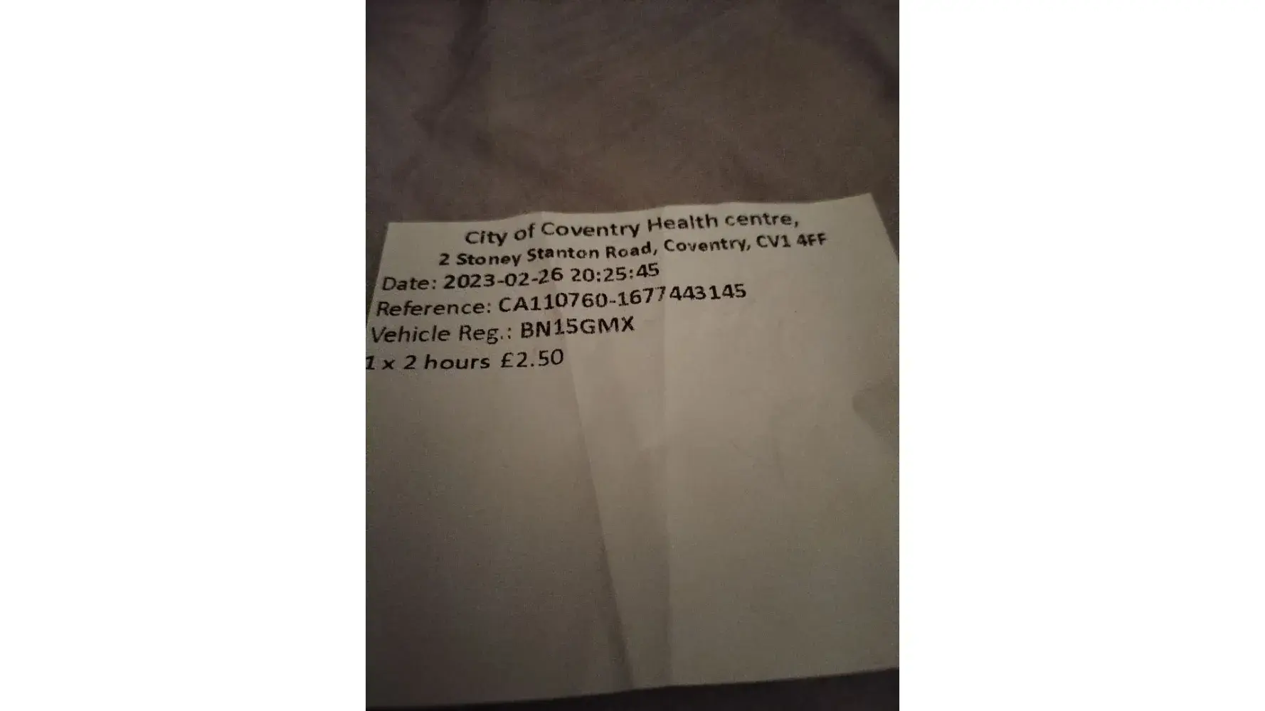 I received a parking fine from parkingeye stating I never paid for parking at Byron street Coventry. I arrived at the NHS city of Coventry health centre CV1 4FF, at 18.45 as I had been asked to attend the NHS targeted lung check up. I was there from 18.45 untill 20.25, as they were running late, my actual appointment time was 7pm. When I came out I put my registration into the payment machine, the registration was not recognised, the machines flagged up a message you could still be fined if no payment it also asked for time of arrival. I put in 18.45 the machine flagged up £2.50 to pay. I appealed and sent evidence of payment the appeal was unsuccessful, had to pay £20.00, they say I was in the wrong place. The receipt from the machine states stony Stanton road, which is also Byron street and Russell Street that they cover, They should change the receipts to show all 3 of their car parks. The screenshot sent is stating they cover the 3 parking places so how I not paid the the £2.50 to them