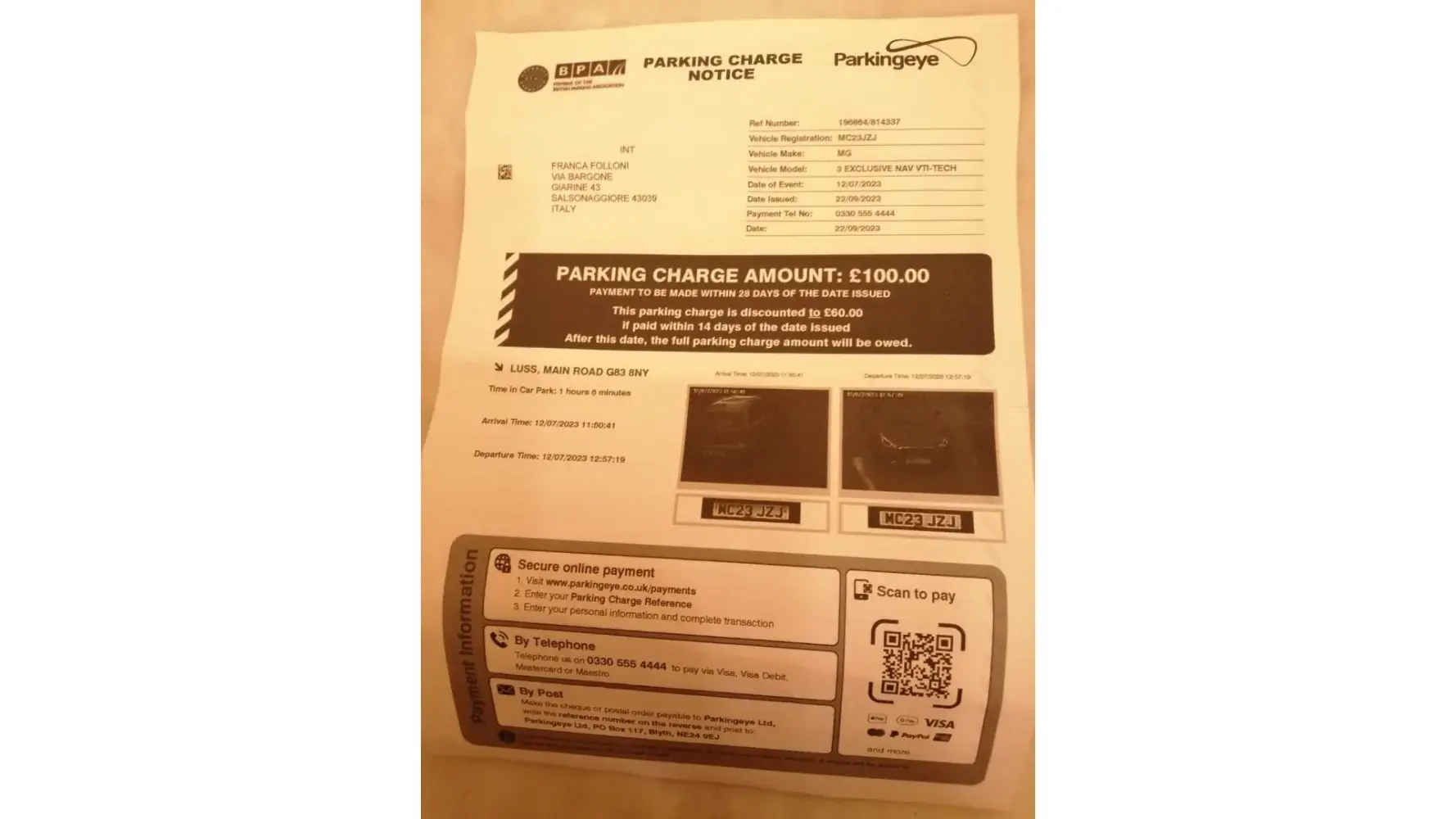 on October 16th 2023 we have receveid by post in Italy the parking charge REF. N. 196864/814337 of 100 pounds.