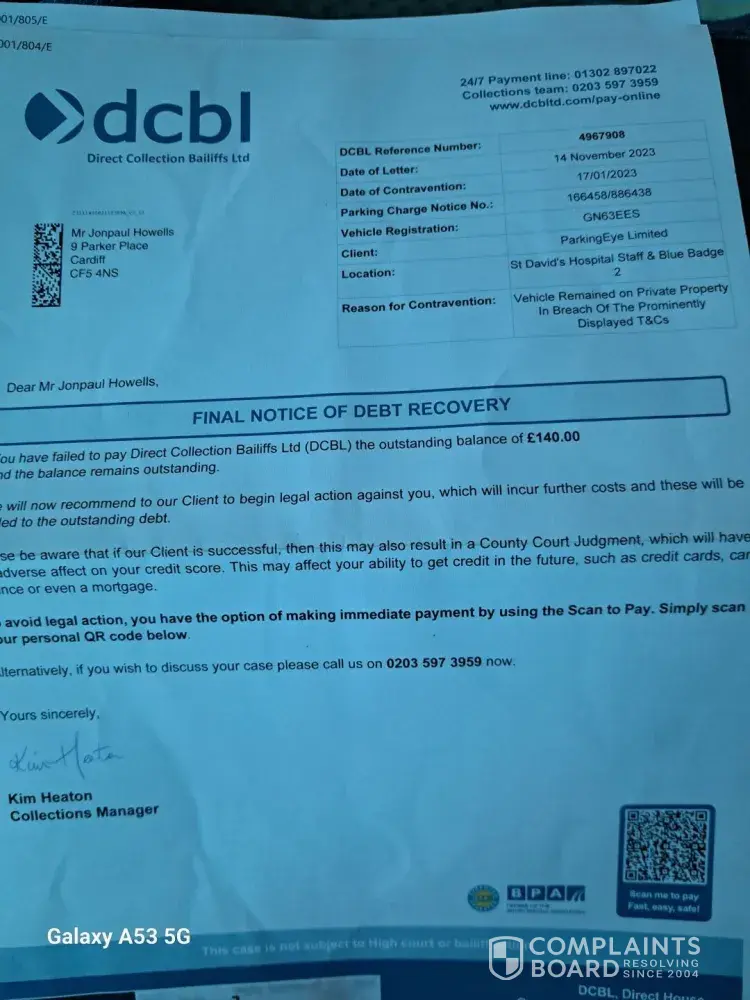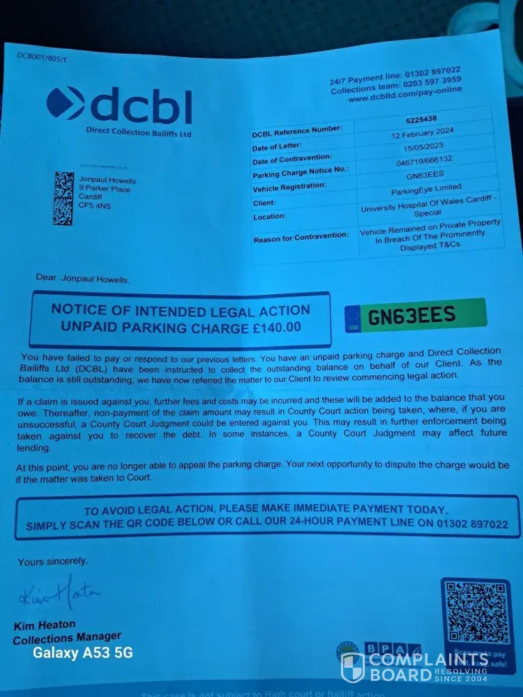 Months later I start getting parking fines, parkingeye had been sending letters to my old address which was still empty then letters started coming to my new address from dcbl demanding £240,I got intouch with dcbl and explained I’d sold the van for scrap but I had informed dvla,was told to get intouch with dvla to get confirmation of the sale,dvla said there was no record and I should have contacted them sooner as a transfer note should have been provided (I’d moved so how was I to know a letter hadn’t been sent),however they acknowledged that the document had obviously been lost in the post and issued me with a letter saying the van had been transferred on the date I sold it (24th feb 2022), I passed this info on to dcbl who got intouch with the client (I presume parkingeye) then got another email saying dcbl had now closed the case,great,or so I thought! A week later get a notification for my credit score,checked it and a ccj had been added,then a letter off dcb-legal saying I had a month to pay £294 to get the ccj off my file.