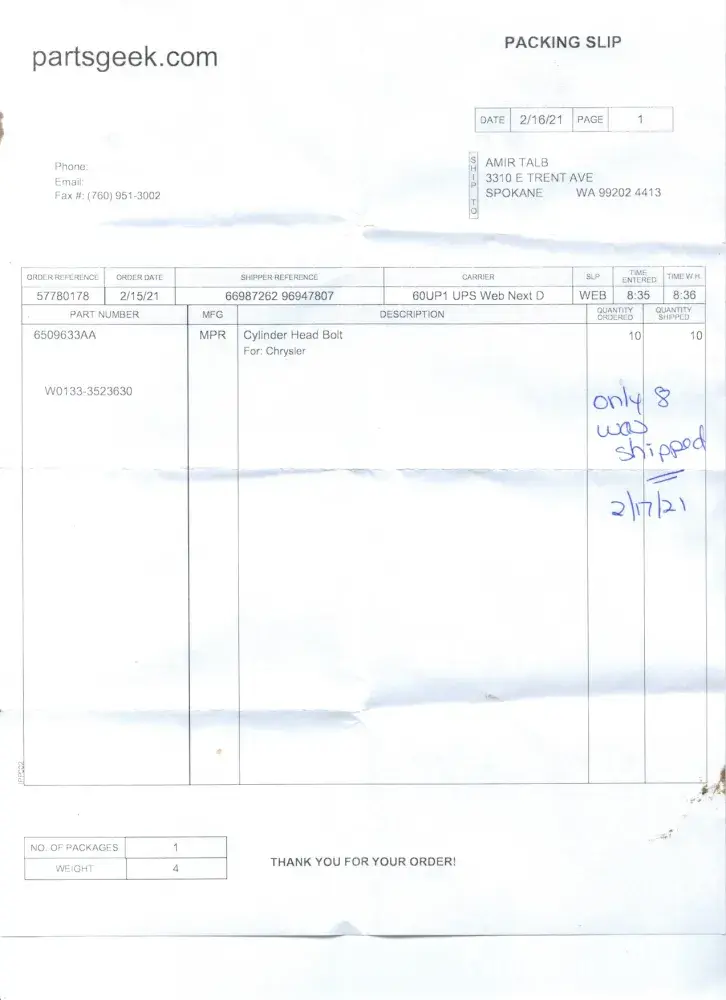 Parts order shipped incomplete
