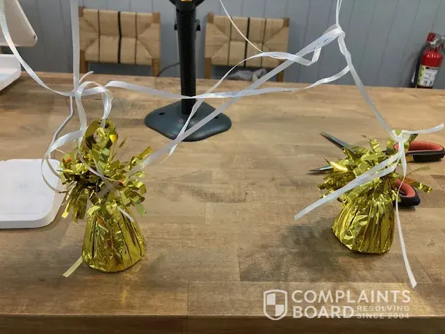 Yesterday I ordered 4 balloon bouquets online for the 1 year anniversary of a family business. I picked them up at the store at around 8pm. I thought the order looked small for 16 inflated balloons but assumed it was correct. I noticed, though, a gold color through the bag and I’d ordered silver weights. The cashier apparently wasn’t going to tell me he had substituted the color. When asked, he said they were out of silver and didn’t have my number to call about it, yet I received texts. I accepted the order in spite of the wrong color weights.