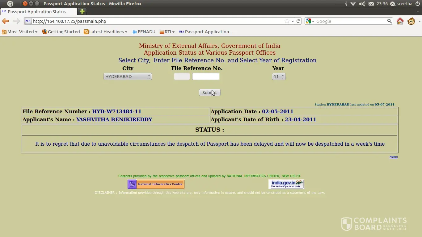 When I check the status today, it showed me "File Reference Number (HYD-Z604405-10) is either wrong or Information NOT available"