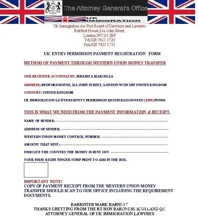 Sir, I have received the email from Mis. Nina Henderson hotel london for employment i have sent the required documents to NINA hotel as well to Ukimmigration Homeoffice. Now i have been asked to sent an amount of GBP ₤199 pounds for issuance of Entrance work permit to Mrs. Rita Marcella and they give me this address and number Uk Immigration Air Port...