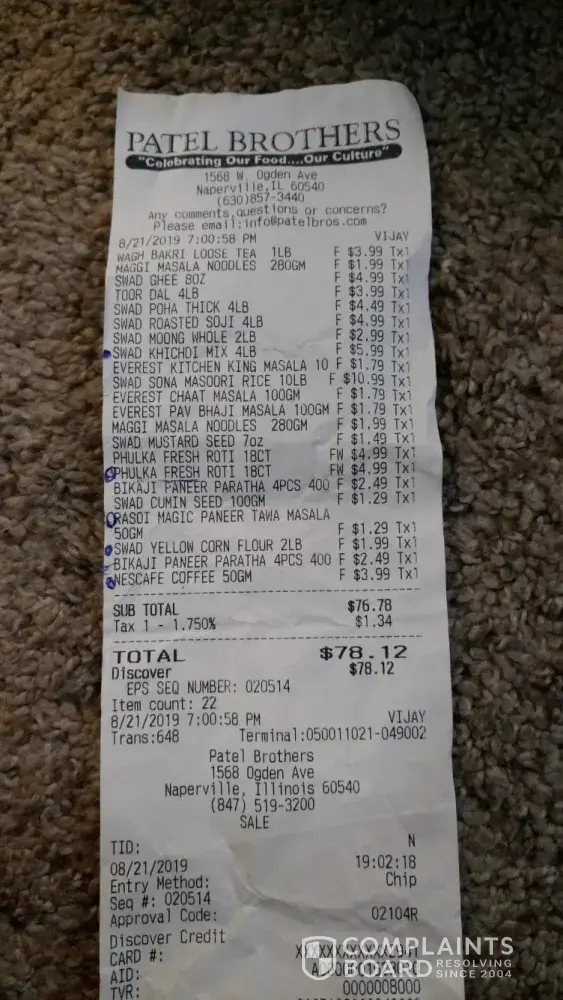 Some of the items were missing from the bill and but is added in the bill. Also the nescafe coffee is was expired and is given to us.This kind of behaviour is not acceptable and is like fooling the customers.We live near to downtown to chicago and coming to naperville just for patel brothers and we got such thing is just not acceptable