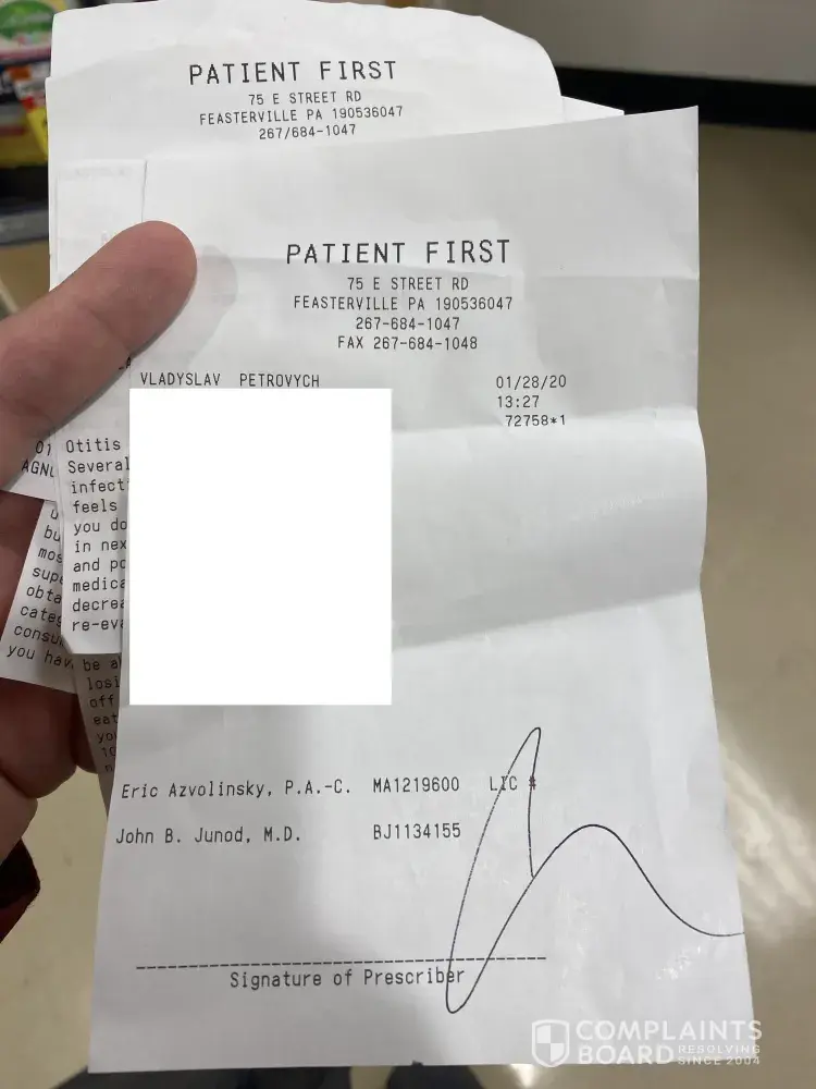I was in the Patient First hospital on 28th January 2020. I had insurance that should have covered all the costs.