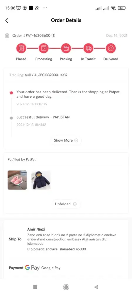 I have paid ordered baby clothing via pat pat on feb 4 to pakistan islamabad. Everything was clear and my order was confirmed. I even paid for express delivery. After waiting for so long my order arrived to Pakistan and when almost my order was here the status showed that it is again shipped to China.
