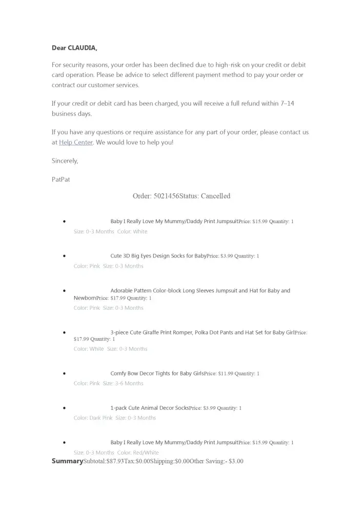 Pat Pat Baby Clothes NEVER RECEIVED PURCHASE