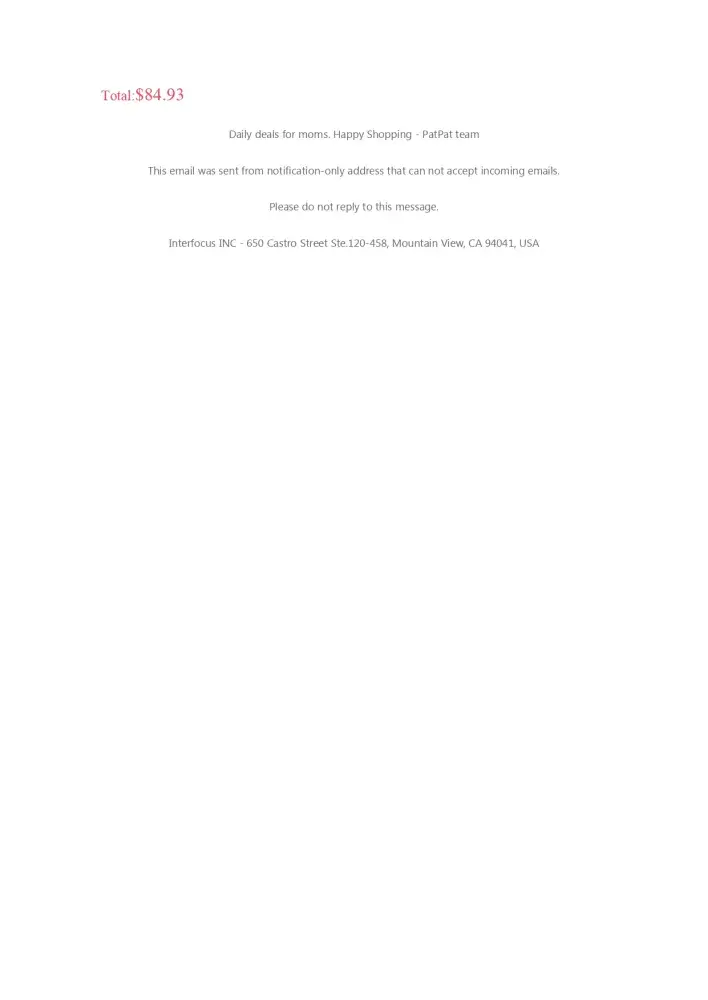 Interfocus says that the above order was delivered 5/13/2019 but my son's family never received it at 16755 Coyote Brush Dr, Unit 74, San Diego, Ca 92127. I wrote back to payment@patpat.com on 5/23 who had emailed me back with delivery details forwarding an email from my son and daughter-in-law confirming they never received my order. I have yet to have heard back. Hoping this will resolve the issue and my order will be sent to them. Thank you.