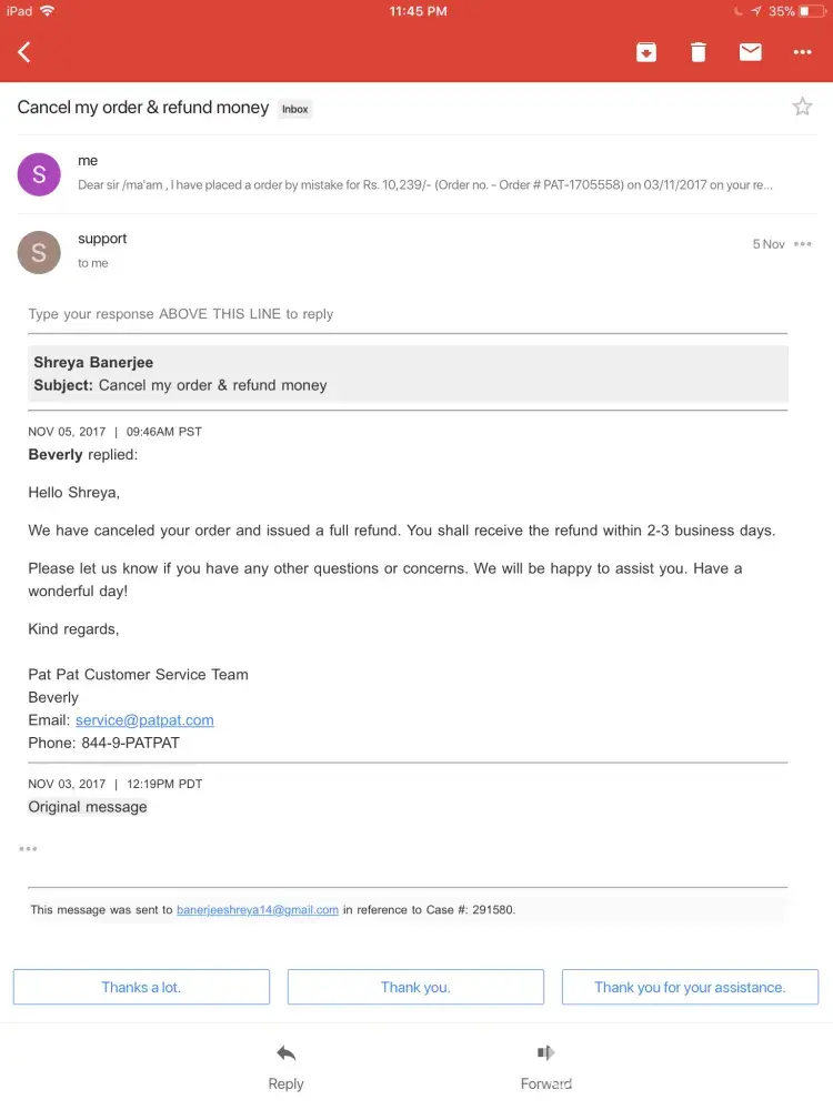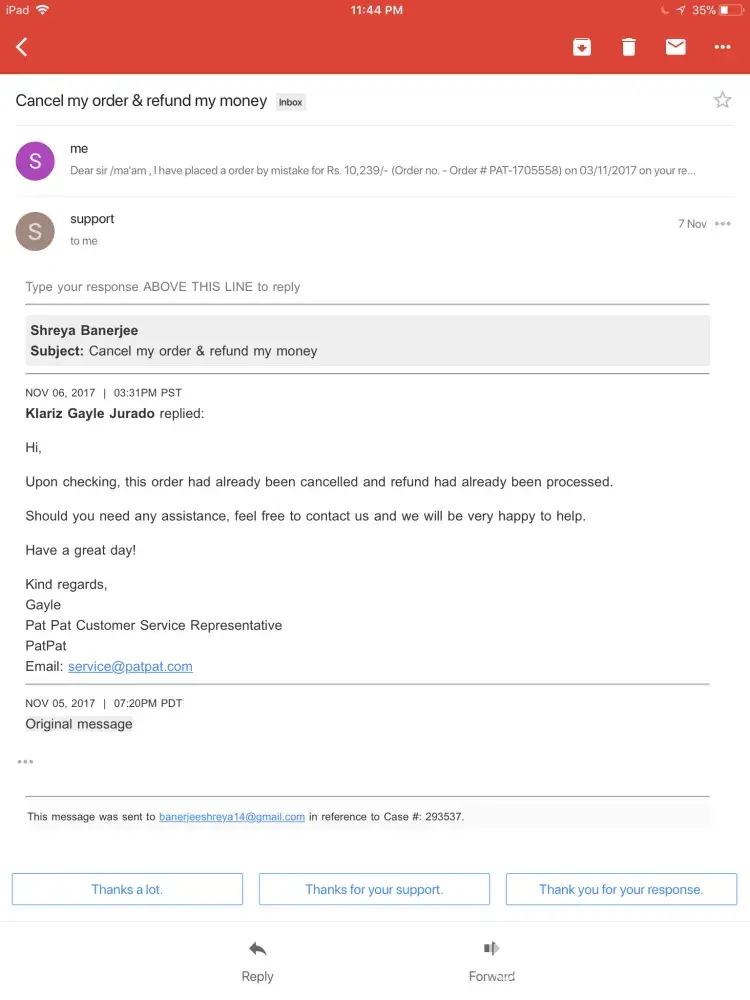Also i have sent mail to service@patpat.com but not getting any proper answer.