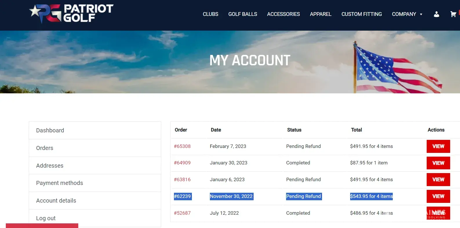 Ordered 5 orders from Patriot Golf this year.. kept many of the clubs (they actually are great clubs) but returned three sets for a refund. Those are.. #65308 February 7, 2023 Pending Refund $491.95 for 4 items #63816 January 6, 2023 Pending Refund $491.95 for 4 items #62239 November 30, 2022 Pending Refund $543.95 for 4 items Like dozens of other follks here the refund cannot be completed as a credit card refund since they switched banks. It is now bordering on 6 months and over 15 emails and dozens of calls and all with promises of "escalation". Representatives there say they send in the request and then Accounts Payable fails to cut the check. Apprently the only way to get a check sent is to post here so let's hope this helps. But don't ask for an email or call back - it never happens. Never been more disappointed in a company in my life. Which is too bad because the clubs are great.