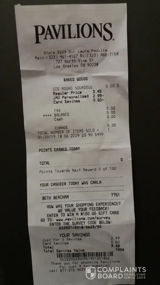 Date on incident: January 20, 2019; Time: 18:42; My membership # [protected] Hello, this evening I shopped at my regular Pavilions store which is located at 727 N. Vine St., Los Angeles, Ca 90038. My visit was fine until I went to check-out with cashier Kandy. I had explained to her that I needed to have bread that I was trying to check-out under a...