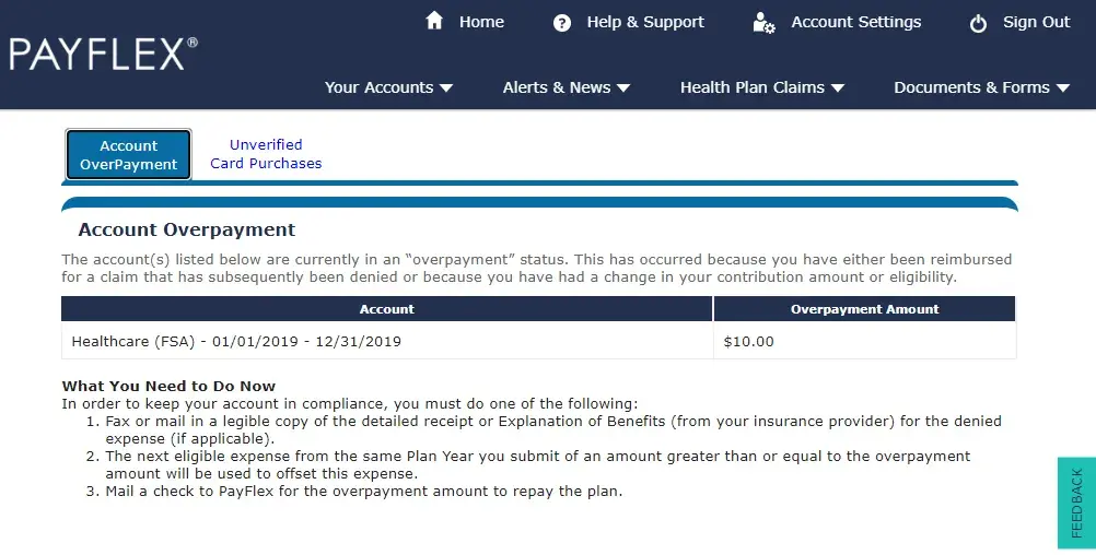 Recently we were denied on a prescription and found the card was blocked, so we just paid the disputed amount so the card would work, in anticipation of some significant upcoming medical costs. Everything on their website at that time indicated there were no other problems - no "overpayments" or "unsubstantiated" charges - and that the card should be clear to use. I then tried to use the card at a dental visit and it was denied, so I paid with my personal credit card. The dental office personnel stated that PayFlex is known for arbitrarily and repeatedly suspending these payment cards, and that this is a common nuisance to their customers.
