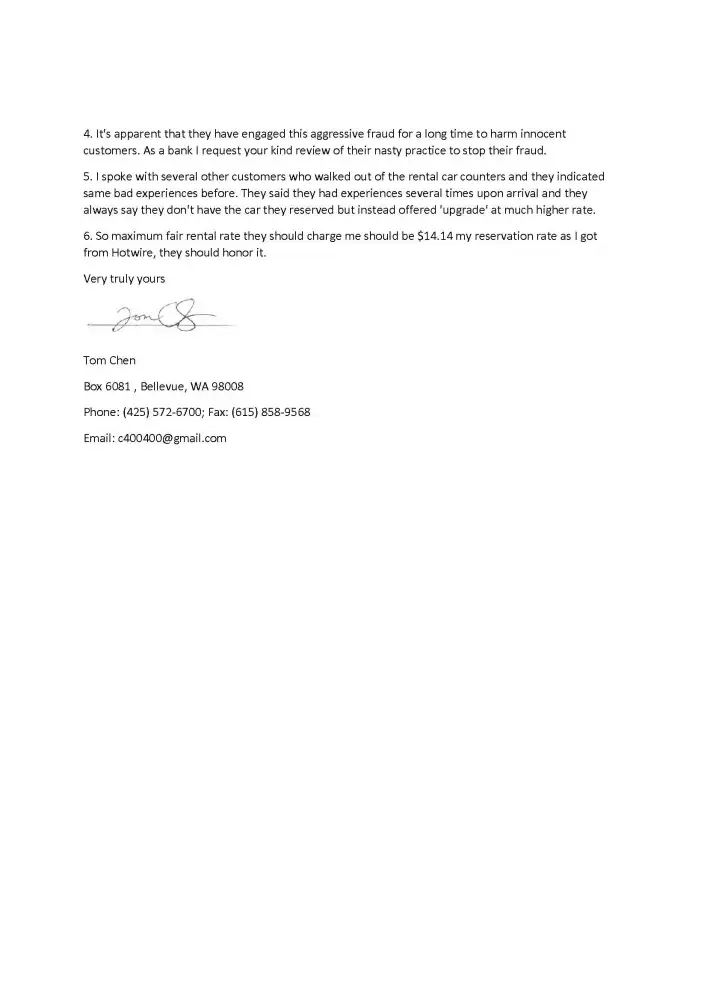 When I reached Seatac airport rental counter around noon they claimed they no longer have the Kia car. "We have a similar car Hyundai Elantra. Do you want an upgrade to that for $16.99?" When I asked them several times that with the upgrade my daily total rate would be $16.99 the black lady kept nodding and saying 'Yes'. On the contract I still see 'upgrade $16.99. Daily ' however when I returned the car at noon on Jan 30, 2016 they charged me that amount, plus they still charged me $14.14 daily for the reservation rate I booked, essentially the $16.99 was extra upgrade fee on top of $14.14. I considered this is a scam, fraud. They told me they would charge me $200 or $400 deposit on the next day which was Jan 19 2016 but they actually charged me $815.39 on the next day. On Jan 30 2016 when I returned the car I found myself in a dilemma so I tried to explain to the hispanic looking counter manager and I even called police to challenge Payless, I demanded them to replay the video they had for my conversation with the black sales lady but the manager simply refused, saying do whatever you I cannot help you.