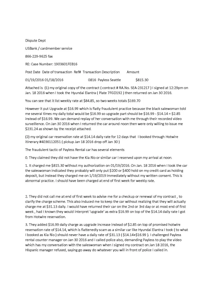 I called USBank cardmember service their rep told me that Payless is wrong, they should simply give me a substitute rental car if they don't have one I booked. However after weeks of dispute USBank cardmember service failed to contact Payless to challenge their charge.