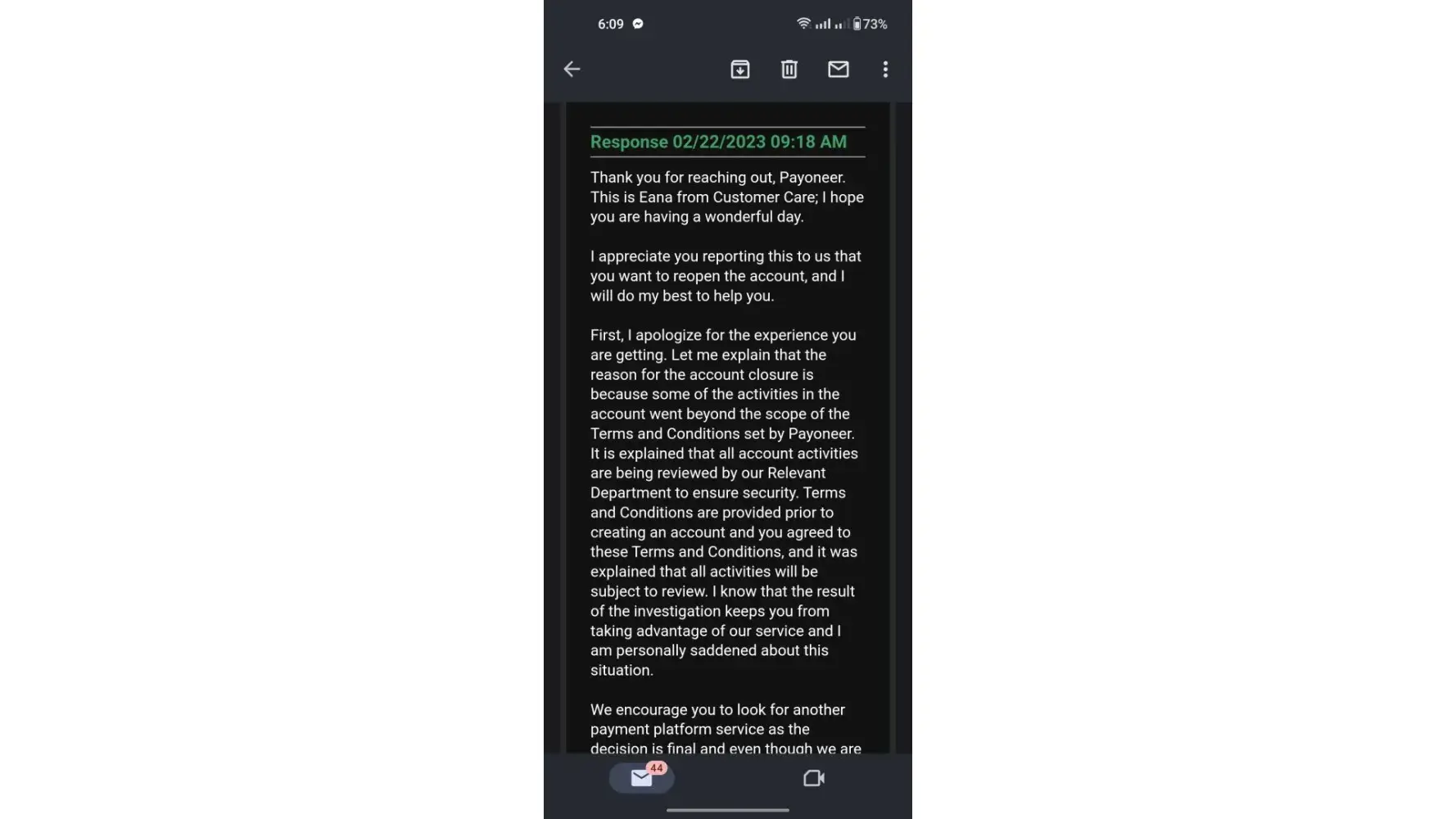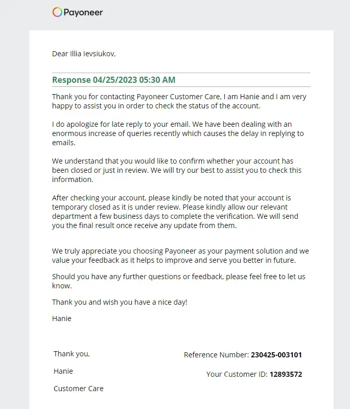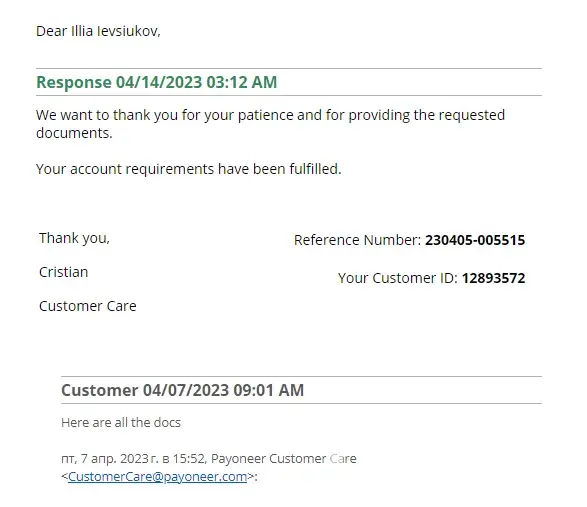 At first, I was asked to provide documents for verification in March 2023. I submitted all necessary documents (including those requested additionally). Verification eventually passed, and the documents were accepted(the Message from Account Approval Department is attached), but the transactions continued to hang. I contacted the support, and they replied that everything was fine, and should just to wait a little. By the way, it wasn't my first KYC, I'd been using Payoneer for many years, always provided all the info they needed, and passed all the checks. But then they blocked my account. I contacted support, they wrote that the account is still under review (Screen 1 attached). And then they blocked my account with all the funds. I tried to contact support many times, but they don't tell me the reason and whether they'll give my money back, they just say that I'm blocked forever. I have been using Payoneer for many years and always provided all the info they were asking for. I was not noticed in scams or forbidden activities. I've just been receiving payments from Upwork. I don't know the reason, but a lot of Ukrainian users faced the same problem with Payoneer.