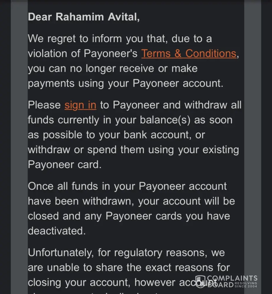 Payoneer put my account on "review" and after few weeks closed it without any explanation or valid reason .