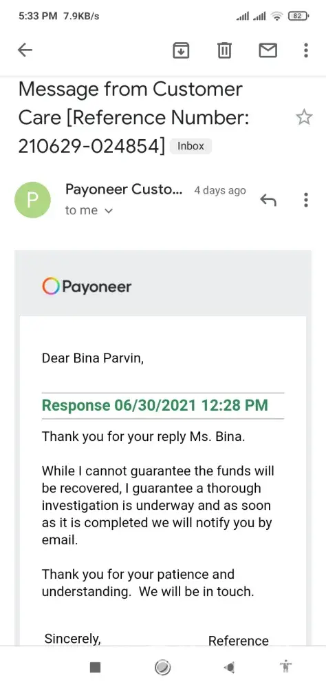 All of above details proved Payoneer Inc. did not fare investigation and they were alert ignore my refund.
