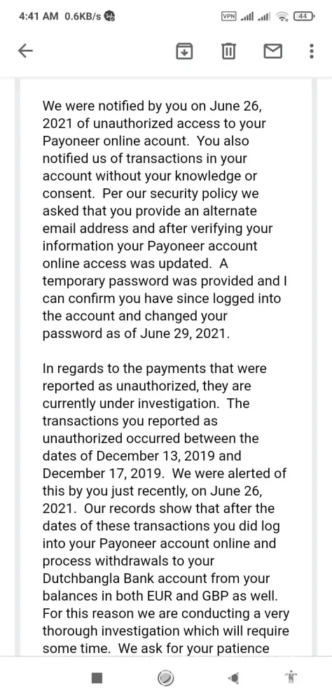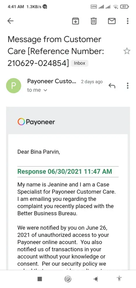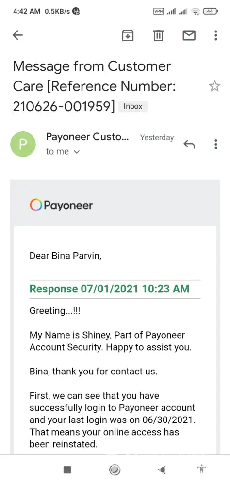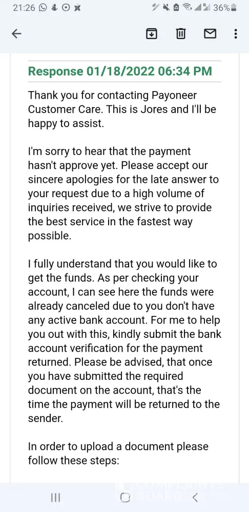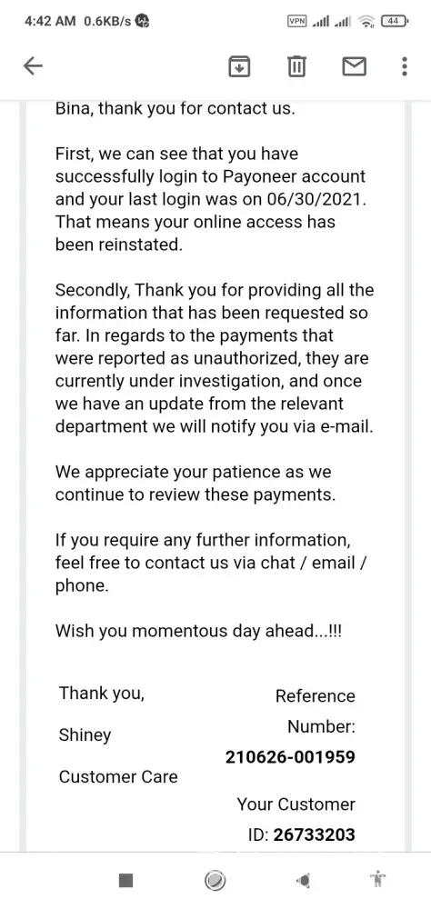 I informed to Payoneer Inc. dt June 26 2121 it's almost one year and half later.