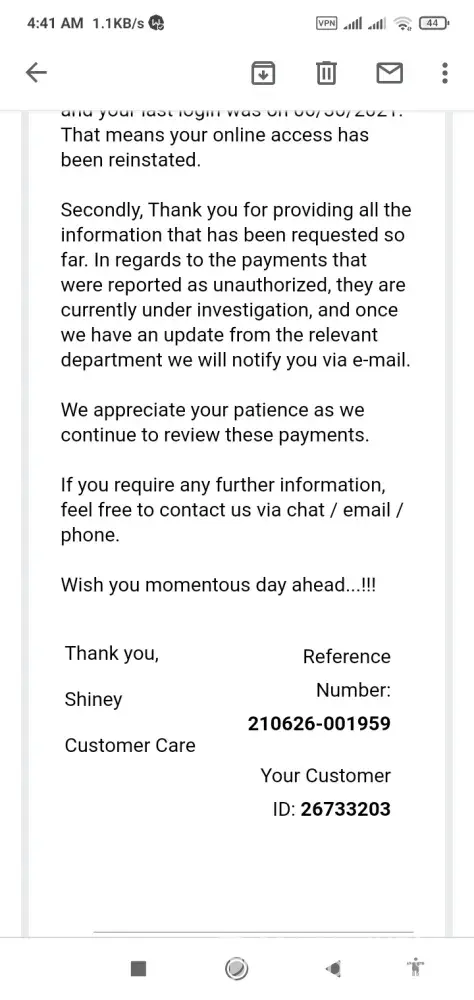 I reply her explanation I did not. Then she said she can not give ay guarantee for money recovered, reverse or refund. So, this her message clearly visible they wont do anything and will not give me refund as Unauthorized transaction made. They were determined how to cheat, scam with me.