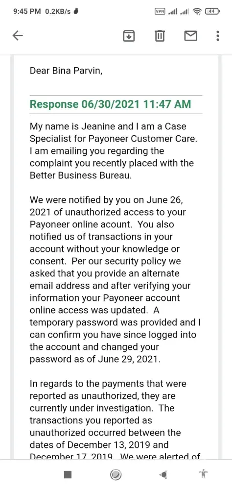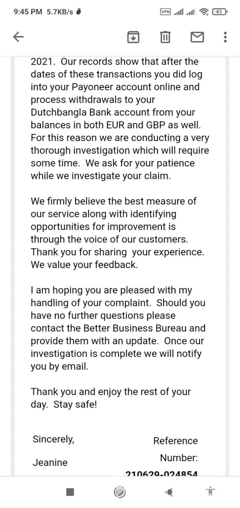 At first they told me I need to verify my identity then they set me with new login info to operating my Payoneer account. Secondly, they said Investigation in underway and I need keep patient. I reply them with details and file report to BBB. Then they email me to update BBB.org report and I thought they will in favor me so I resolve the report on BBB. Now once again I like submit new report.