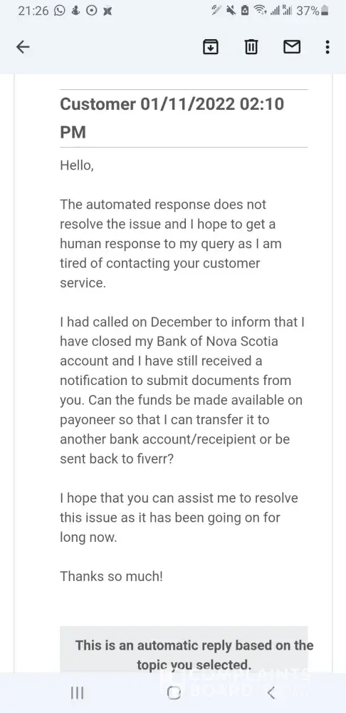 I am tired of contacting customer service since Dec 28, 2022 by phone (twice) or email (twice) over the last month to explain to them that I have closed that bank account therefore, I cannot provide verification documents about it. They keep telling me that someone will contact me to provide me with a solution or that they will escalate the problem but nothing happens, I just get the standard message to provide verification documents the closed bank account. I have tried to upload new information about my bank account but it would not allow me citing that my name is different! My money is stuck; I have even asked them return my money to fiverr but nobody is helping me!