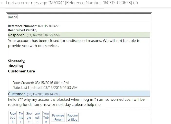 I and my cousin was faced with the same situation. Our accounts were blocked for undisclosed reasons, and we could not get any explanation of it. MA 104. We use the same computer and the same IP. it is nonsense to block accounts if people use the same IP. Overall impression about Payoneer - TERRIBLE COMPANY!