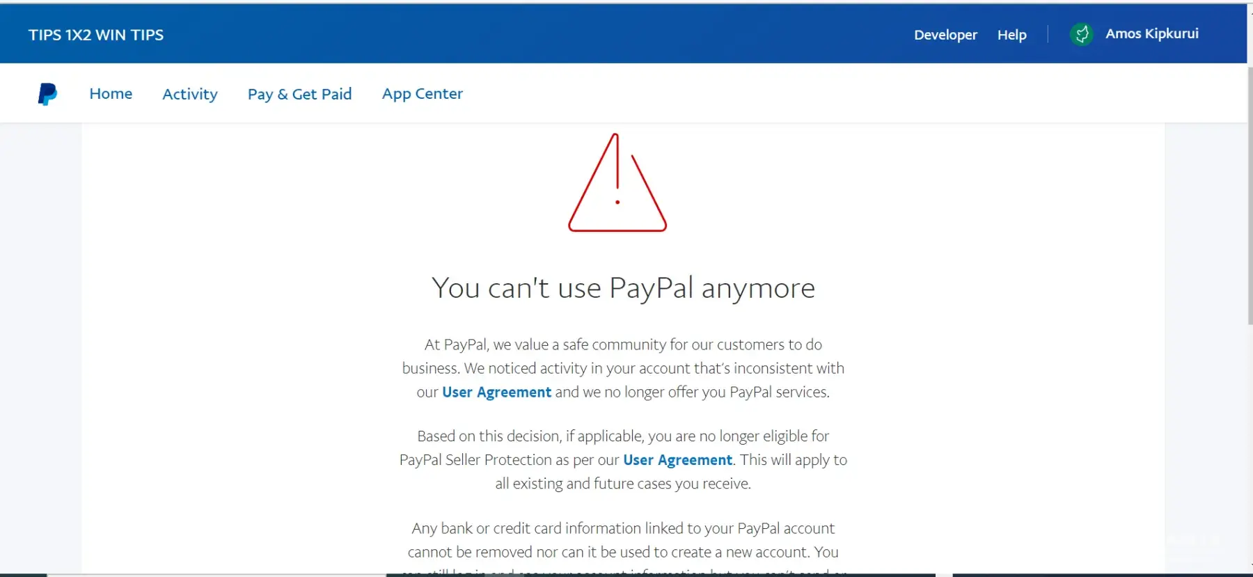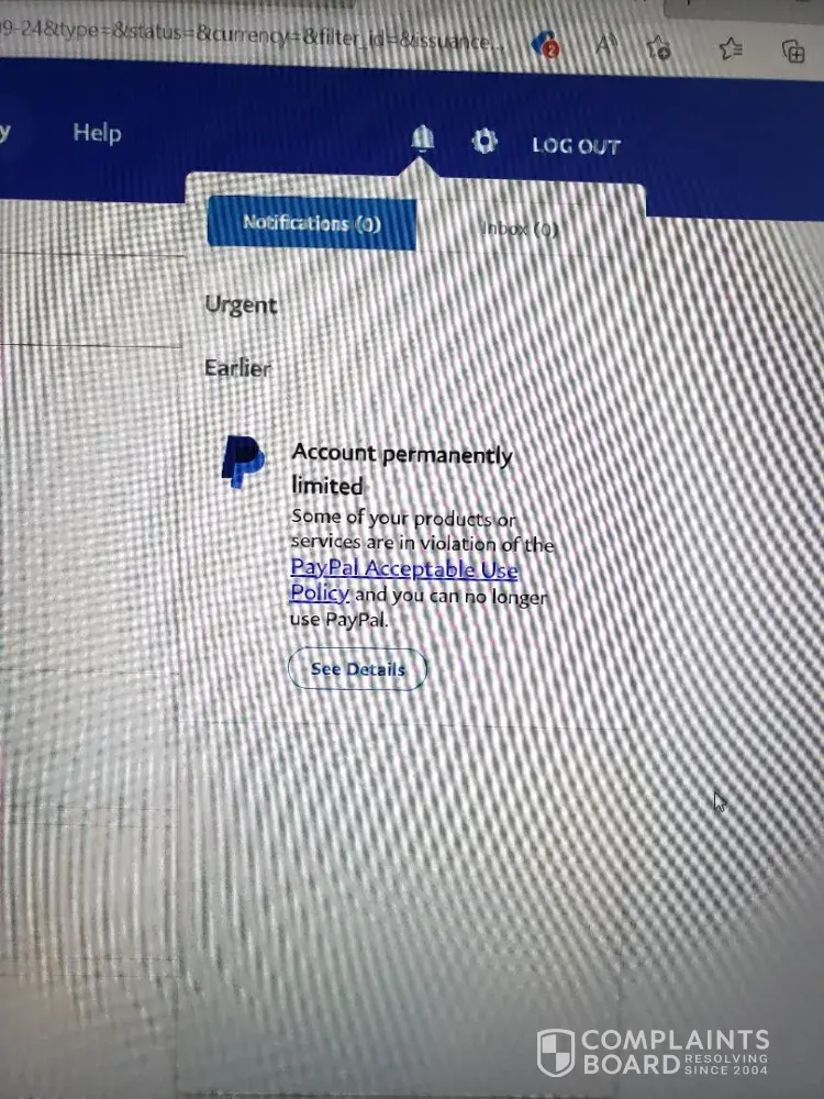 After a review of your account activity, we’ve determined that you’re in violation of PayPal's Acceptable Use Policy. As a result, your account has been permanently limited and you won’t be able to conduct any further business using PayPal. This is permitted under the PayPal User Agreement sections Restricted Activities and Actions We May Take. You must remove all references to PayPal from your website(s) and/or auction(s), including removing PayPal as a payment option, the PayPal logo, and the PayPal shopping cart.