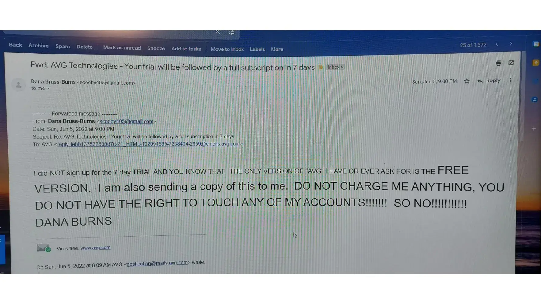 Paypal has made it almost impossible to file a complaint. AVG had me on a free trial and the free trial ended on Jun 12, 2022. Well AVG sent me and email on June 5, 2022 letting me know that I only had 7 days left. I responded to the email letting them know that: NO! I do NOT want AVG and they have NO RIGHT TO GET INTO ANY OF MY ACCOUNTS OR TAKE ANY MONEY OUT OF ANY OF MY ACCOUNTS!. I know the response went through because I did not get nothing stating otherwise. On June 12, 2022 they took $81.31 out of my paypal account. I sent a complaint to Paypal and I had to copy and past the response on the response to the email from AVG because there is NO WAY of posting it or dragging it to the little section they give you. Paypal sent me an email stating they got my proof, but then denied my claim. I explained on their FB page that I can not get it to let me post the actual EMAIL and I need to know how to get it to them. It would NOT sent without a picture so I put a picture of a Pontoon as I did not know what else to do. THEY DENIED ME AGAIN. They are wrong and I do still have the email from AVG and the response. I do not know how to get it to anyone that can do anything about it. The pictures below show the email, if there is a way I can forward the whole thing to you I will do it. Please help me!