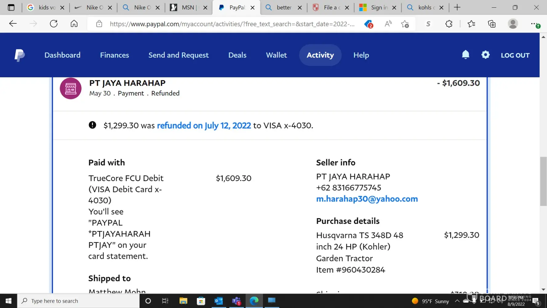 I ordered a tractor for my father for Father's Day on May 30, 2022, for the amount of $1,299.30 with an additional $310 for shipping. Therefore, the grand total was $1,609.30. The merchant said it would be delivered in 2-3 weeks. After waiting 4 weeks, I tried calling them at the number provided, this number was not a working number. So, I emailed them several times, with no reply. I decided to ask PayPal for hep resolving this issue. After determining the merchant was fraudulent, I was told I would be getting a refund.