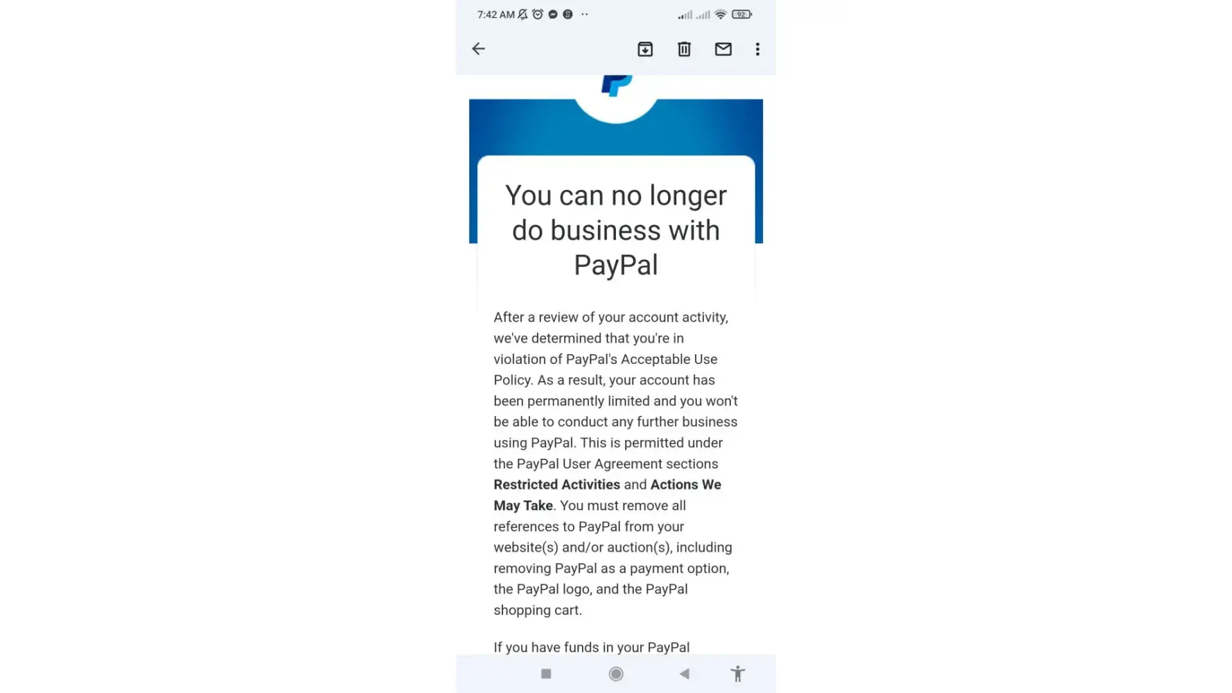 Then I was hospitalized for several months. A loved one tried to pay my PayPal bill on my behalf and they wouldn’t let him. The automatic payments began to fail. After three months PayPal closed my account without a formal warning. No emails, no physical letter warning me about the closure.