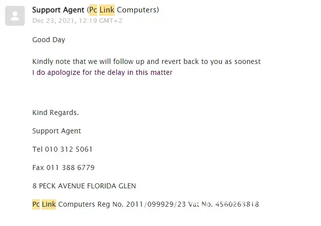 I have used pc link for just under a year now, spent about R50K in the last 4 months with them, my first incident was when a item I ordered was out of stock, I had no way to call them no replies on my emails upon email eventually a month later I received my package.