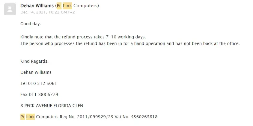 Pc Link Computers Reg No. 2011/099929/23 Vat No. [protected].. I have not received my refund to this date!