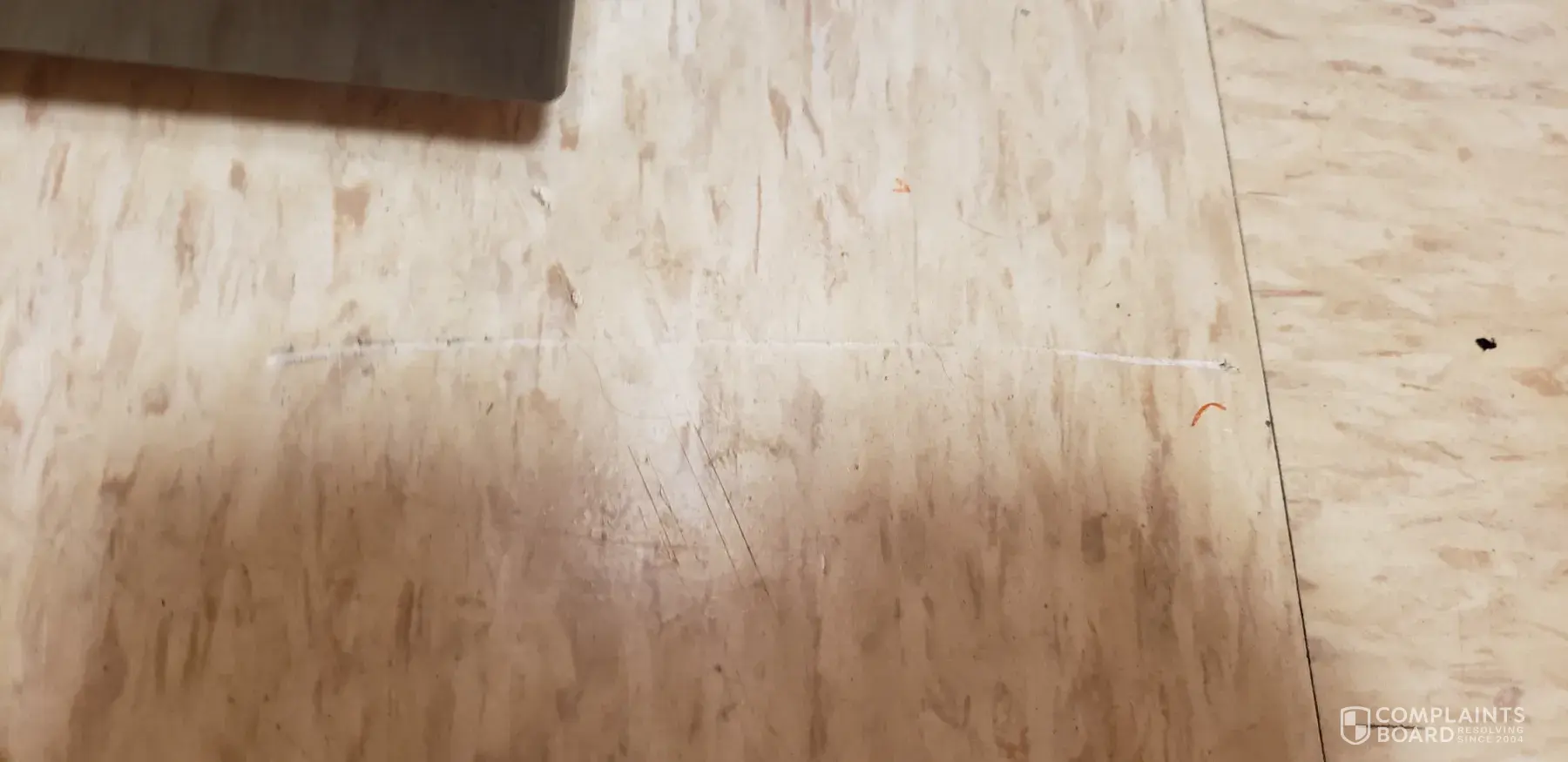 damaged flooring and dented refrigerator