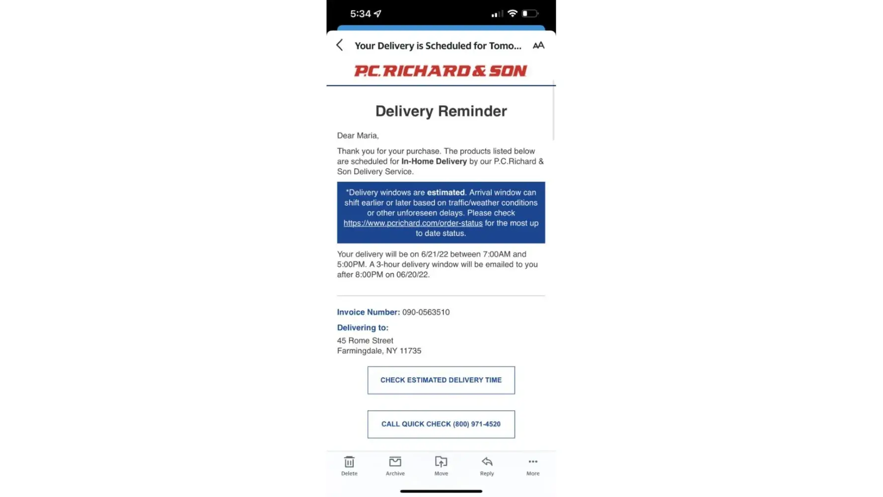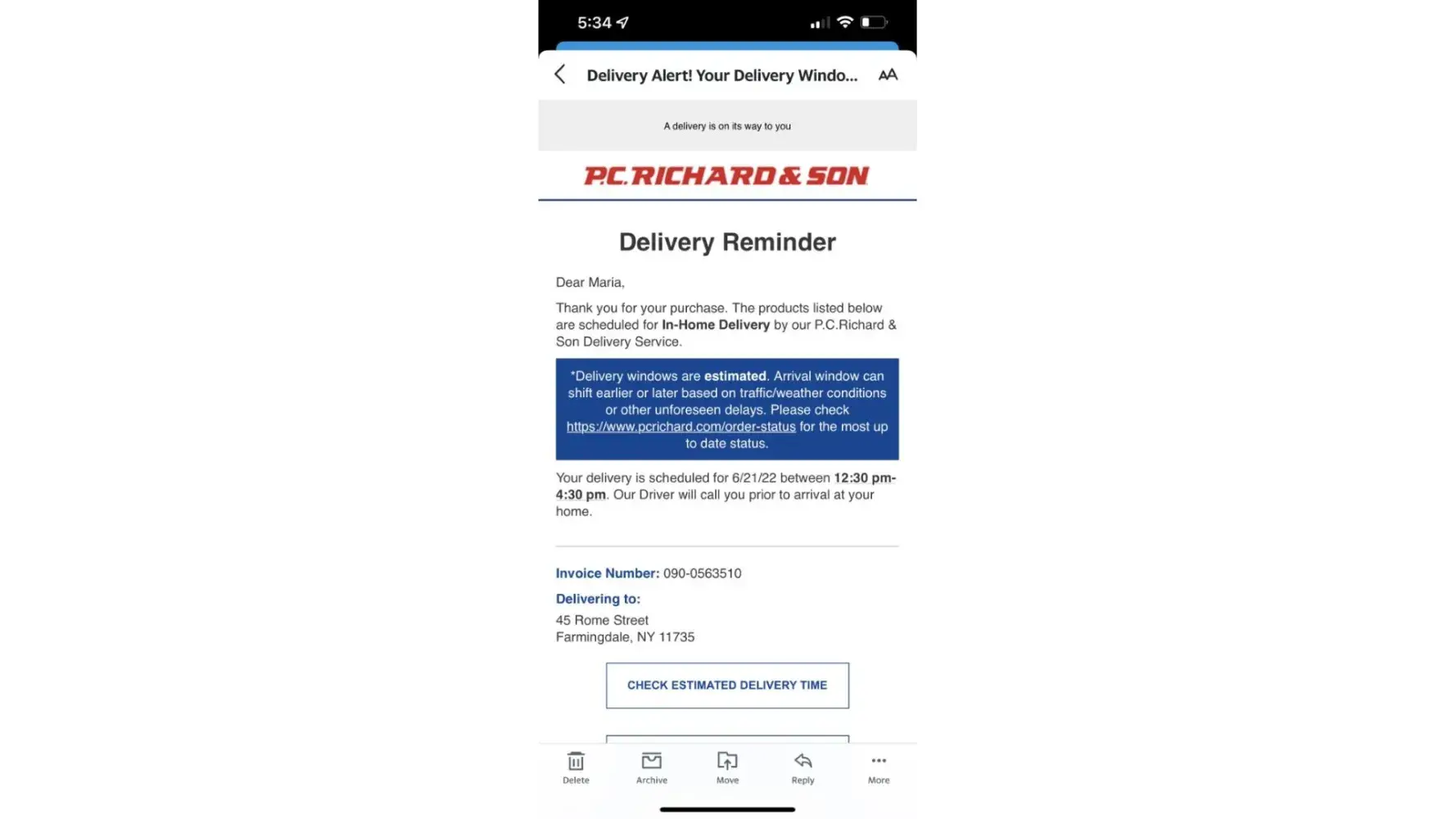 Confirmed the delivery date online and received a call from the sales rep saying to be home to receive the unit on Saturday.