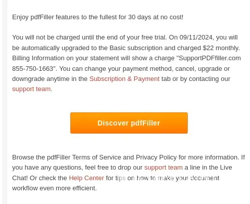 You will not be charged until the end of your free trial. On 09/11/2024, you will be automatically upgraded to the Basic subscription and charged $22 monthly. Billing Information on your statement will show a charge "â€SupportPDFfiller.com [protected]". You can change your payment method, cancel, upgrade or downgrade anytime in the Subscription & Payment tab or by contacting our support team."
