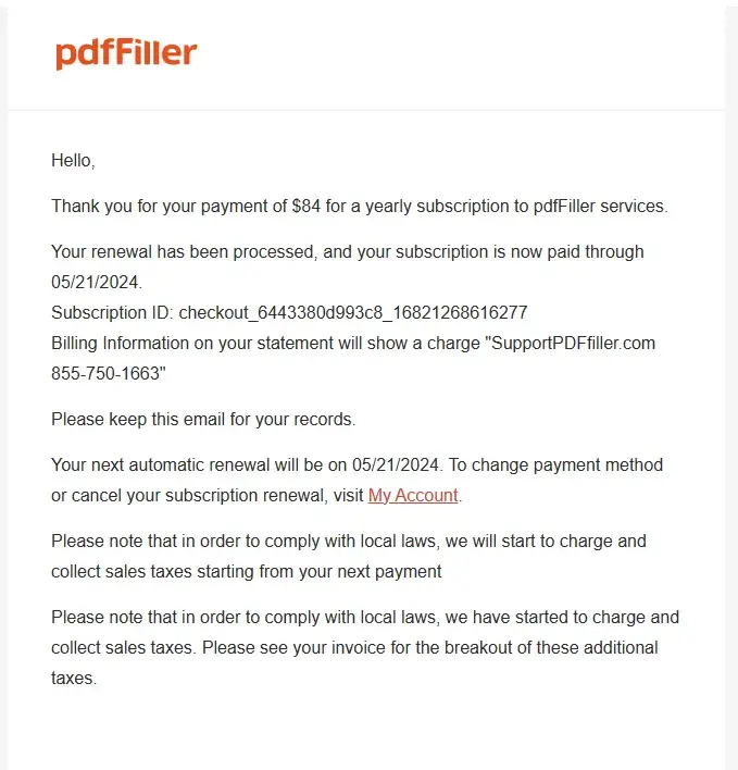 Thank you for subscribing to the pdfFiller Annual Basic plan. Your payment has been successfully processed.