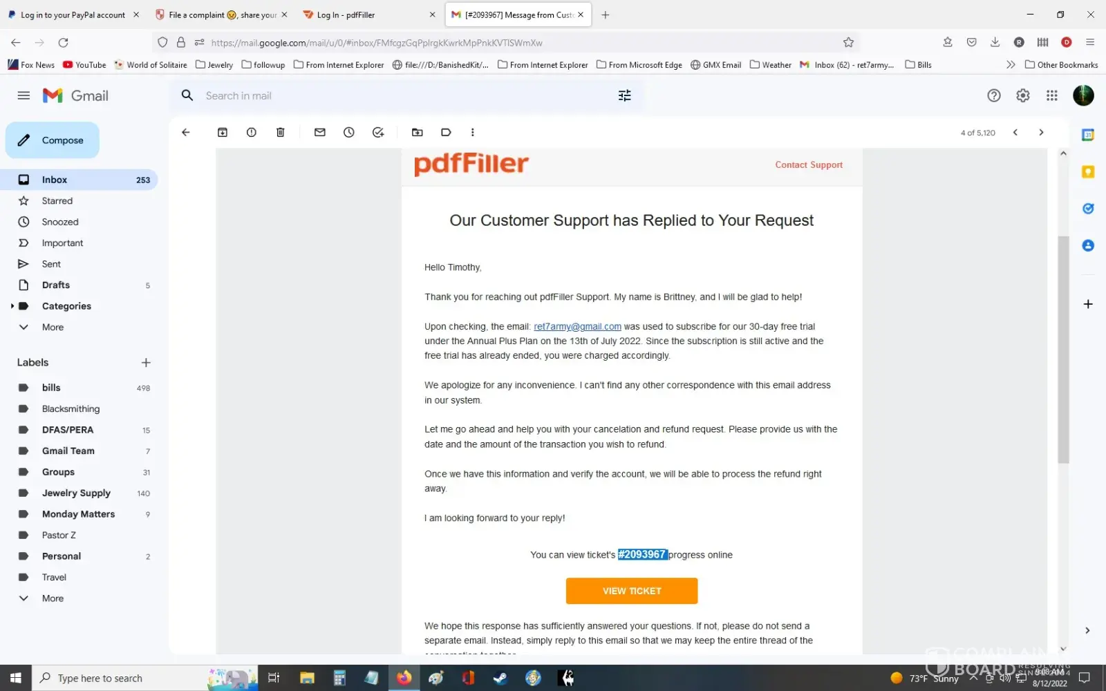I contact PDFfiller and request that my account be closed and the payment be refunded. A Brittany from PDFfiller responded and gave Trouble Ticket #2093967 along with the request to respond to the email in order to keep the thread going.