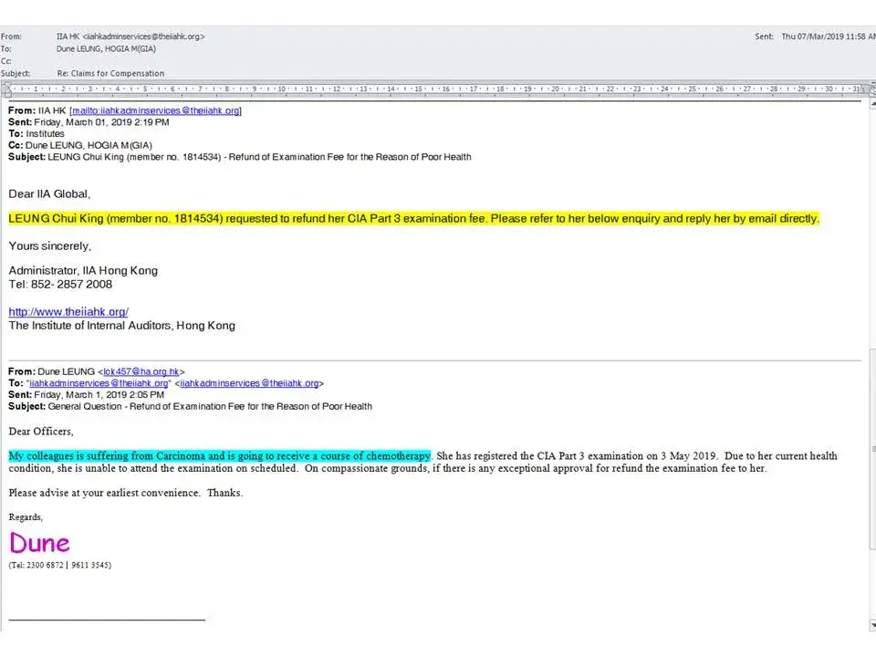 The Administrator, IIA Hong Kong admitted that they have mistaken my profile against Ms LEUNG, Kwai Fan and cancelled my exam by mistakes.