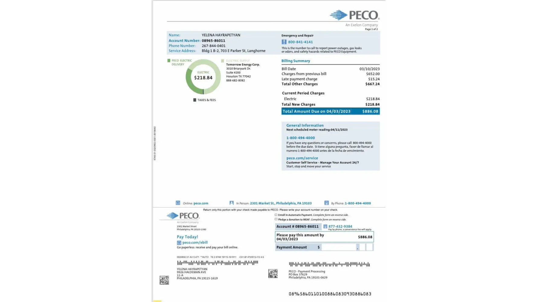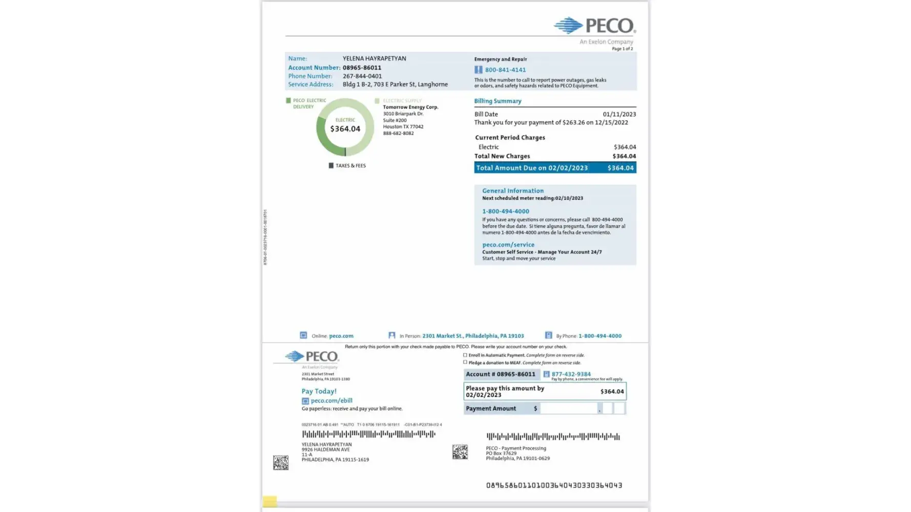 I have been waiting for my bills for a few months and when I called the customer service of PECO, I found out they were sending my bill to a different address without me. Also, the staff of the PECO company changed my billing address, however, I did not give my permission to them. Since June 2021 I have been living at 703 E Parker St, bldg B-2, Langhorm, PA 19047, and received all my billing by the following year. At the beginning of 2023, January I stopped getting my bills, and I worried about where my billing is. After, several phone calls, and many days of nervous conversation, I finally found out that they have been sending my bills to a different address which is 9926 Haldeman Ave A11 Philadelphia, PA, 19115. this is not my fault that I did not pay, and I would like to get an appeal. Also, I am doubting that it is not the correct bill because this winter was warm. I compared my last year's bills because 2022 was colder than 2023. Moreover, I used an electric stove and a hitter. But this year, I only used Hitter for nighttime.