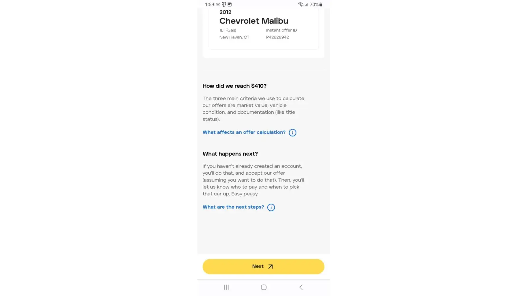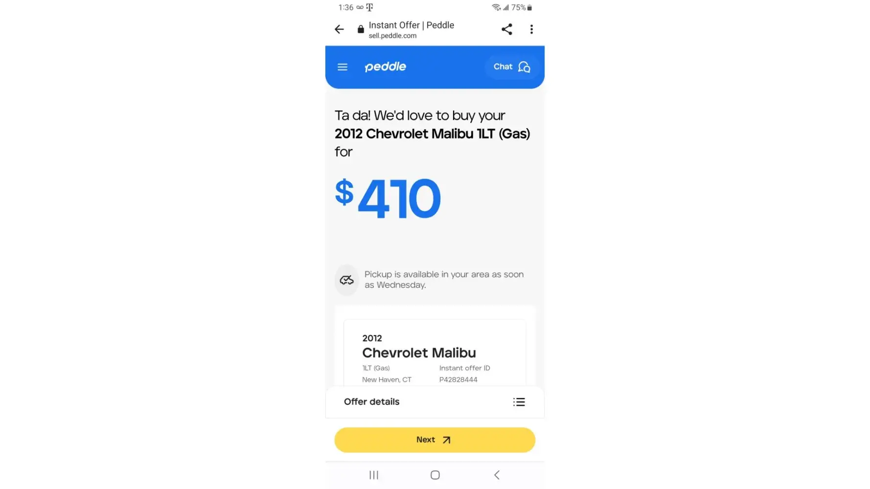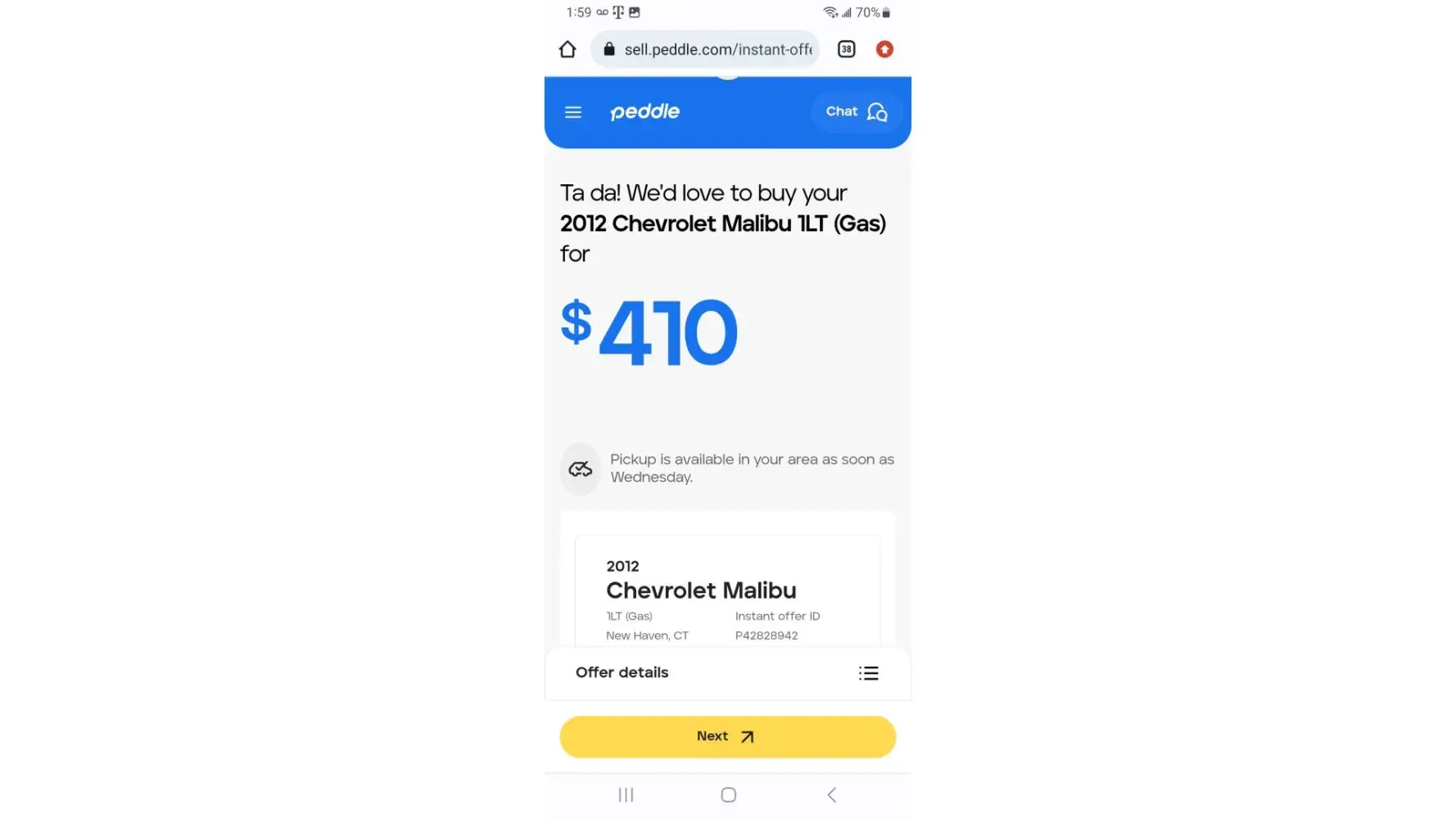 I sold peddle my car 2012 Cheverly Malibu for 410 however they reschedule and had me to meet them with papers and were to govevme 410 cash howexer o recieved a check trusting them to be offuxle honedt business folks I took chevk and legt un a rufh going through a hard tome and death w the reason fir me to srll car who bad originslal everything wheteas I ciuld havr sold the doors and made over 280 u am upset and they are nit beuvg redoectful honestvbysibess folks I drmand ny funds with a increase a total of 500 plus ian aplogy e slluppose to give me 410 in cash however they gave me a check for 280 I did not release it until I Cash the check which was supposed to be cash I m really upset I trusted them I want my money today shsntsi rigers