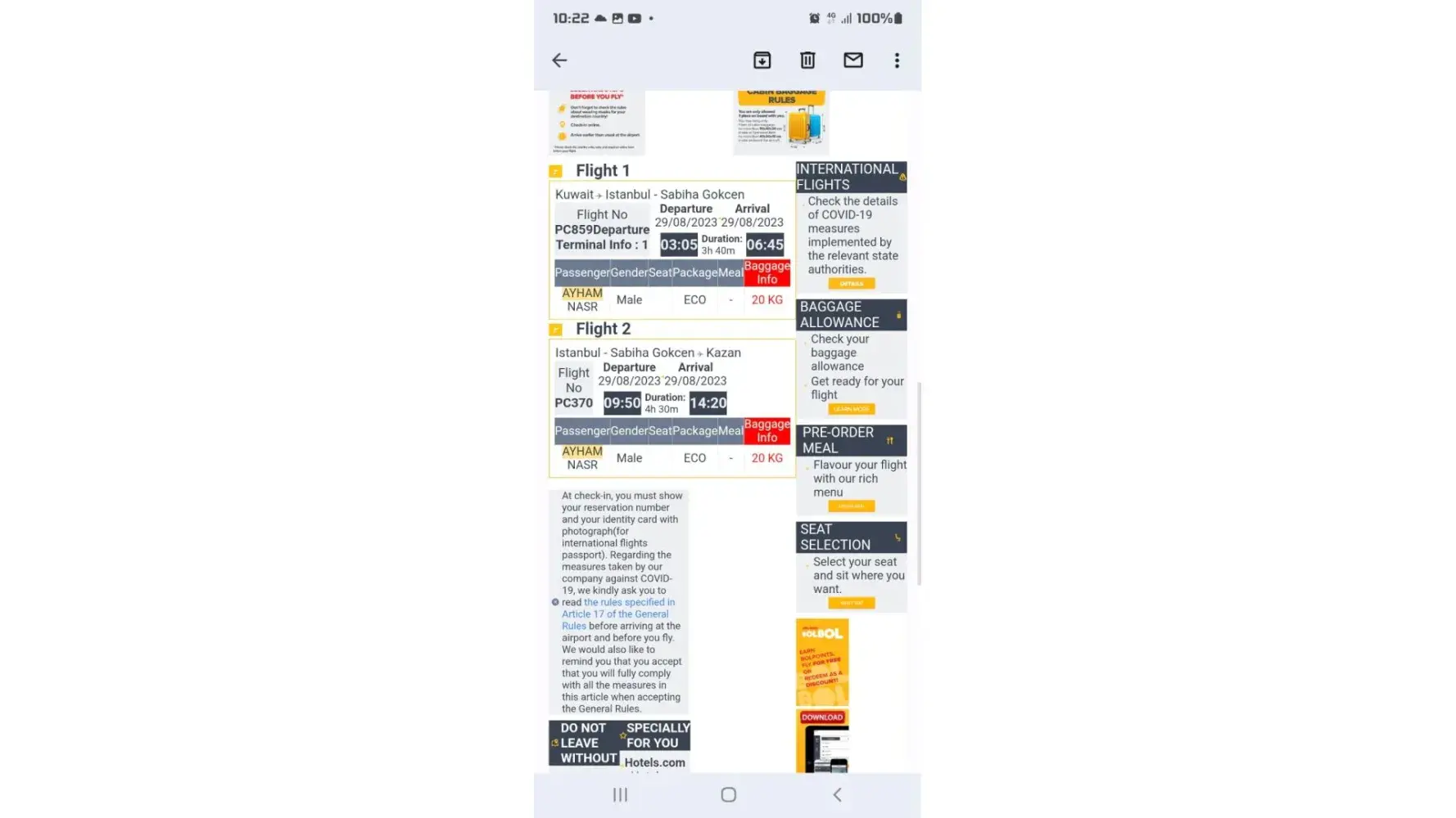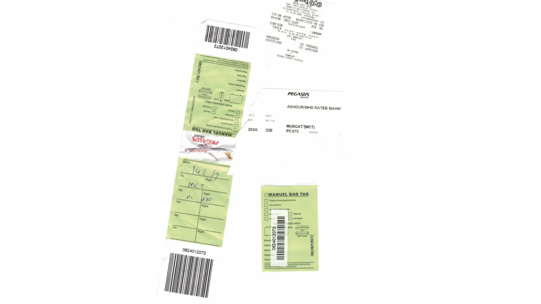 My name is MHD Rateb Ashour, passport( N014154394), I was back from Sabiha Gokcen Airport to Muscat Flight No PC870 Departure 26/10/2023, Arrival 27/10/2023,02:35, my seat:22E