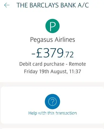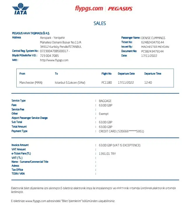 When I returned home I was informed how to access receipts on the Pegasus website. It was here that I first saw a receipt for the flight on the 18-September 2022 which showed it was paid by Loveholidays credit card number. There was no receipts for the Ticketed PNR QYTGJ6 for the 18-October 2022 which Pegasus airlines had sent to me.