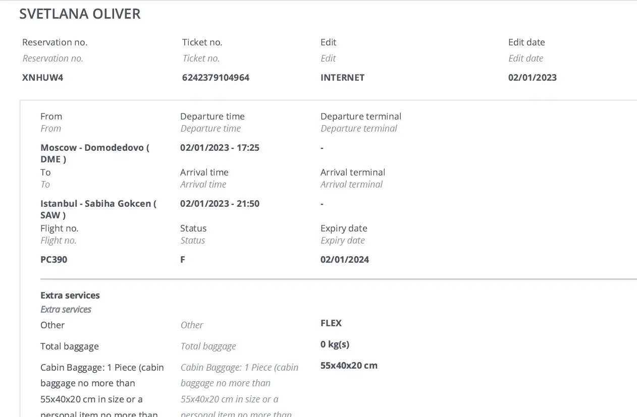 My flight PC 390 Moscow – Istanbul was to depart at 17.25 on 02/01/23 and was delayed by 7 hours to leave Moscow at 00.39 on 03/01/2023, which I had to spend in the stuffy airport without any food or possibility to spend the time in a hotel as there was no clear information when it would take place, the table showing 3 am at some point.