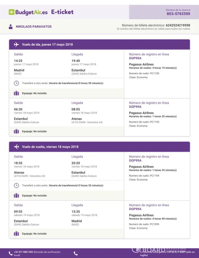 This resulted in me being forced to buy a return flight to Madrid as my business appointment in Athens was missed. No Pegasus staff offered me any solutions or a free flight back or any form of compensation.