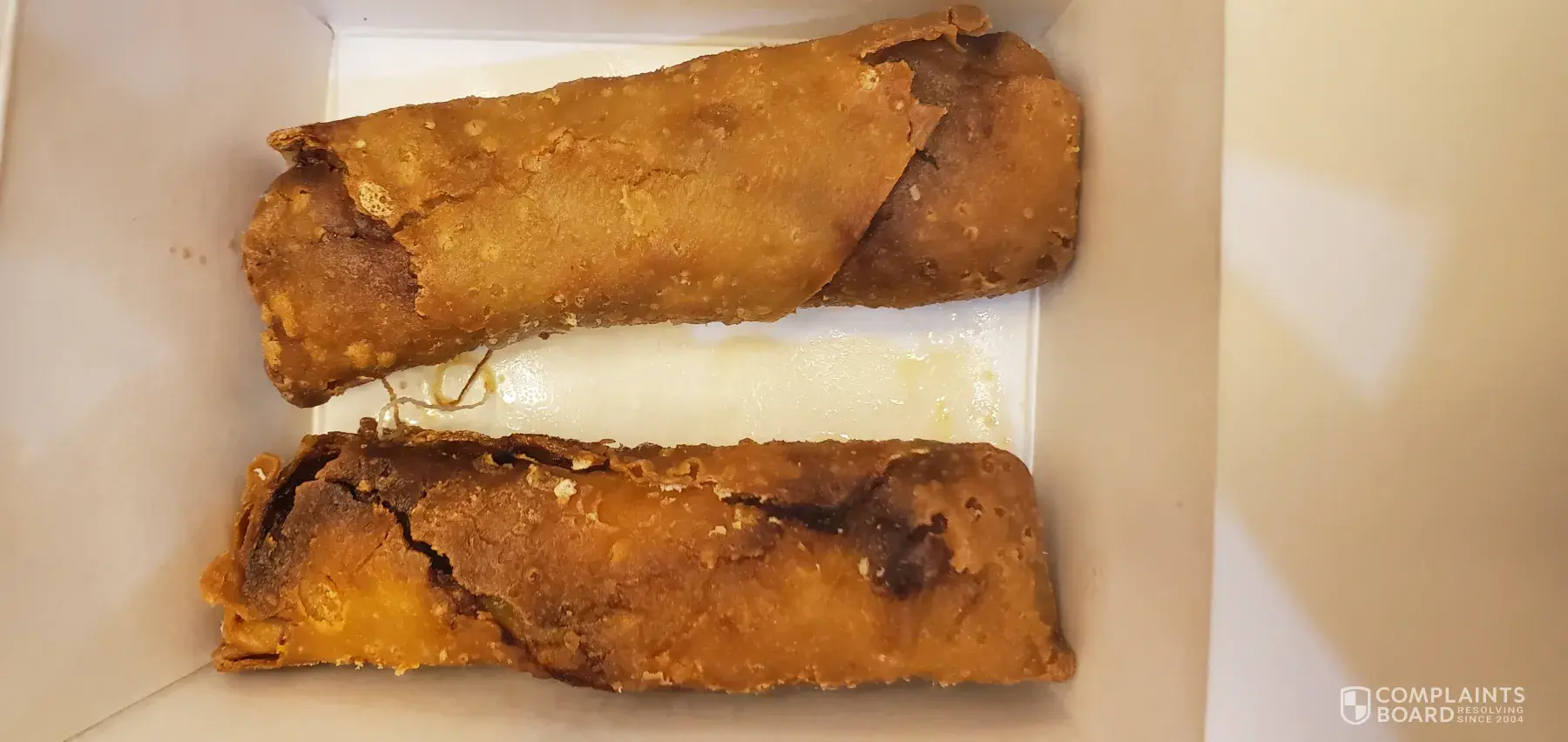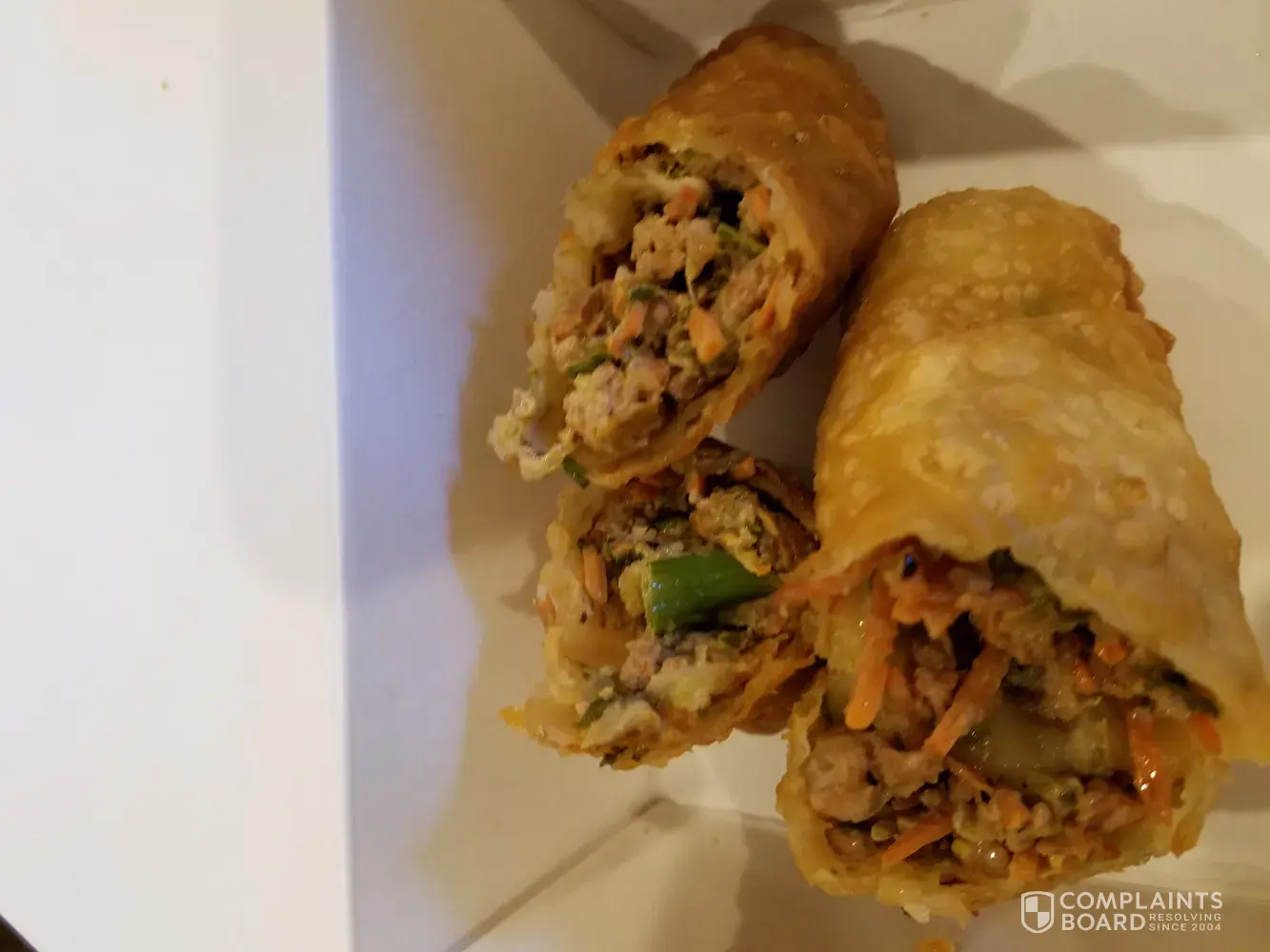 We ordered 4 pork eggrolls and had to spit them out. I've attached a photo of the remaining 2. They look like the others and smell like the others.