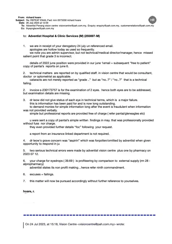e. invoice was for 2 eye examination, but adventist refuse to give either orally or written information on cataract grading i.e. no/nc.