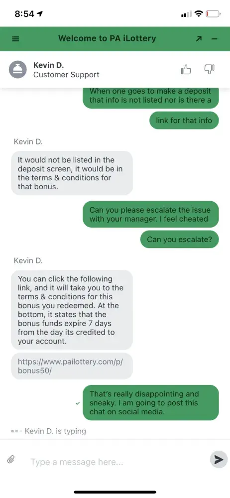On 7/16 the PA withdrew $16 bonus money from my account. When I deposited my money the app did not state a specific expiration date or that the bonus was subject to an expiration. When I had a chat session Kevin D I explained what had happened and the lack of notification and he shared an URL with a generic policy and denied my request. Such expiration should be list upfront like that are in coupons. I feel like the PA lotto leadership stole $16 bucks from me and hid behind some deep hidden policy. I have been a long time customer, and you made feel feel that cheated. Pa lotto leadership lacks perspective and their support team reflects it. I hope they enjoy my $16.