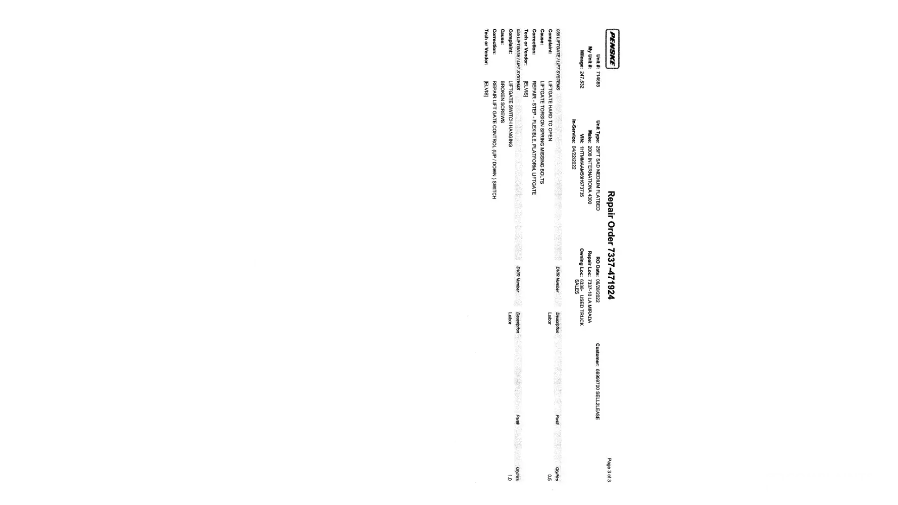 Rented With Damage YES as Documented by Matthew OUT, BUT Entered by Matthew into Penske database as “NOâ€